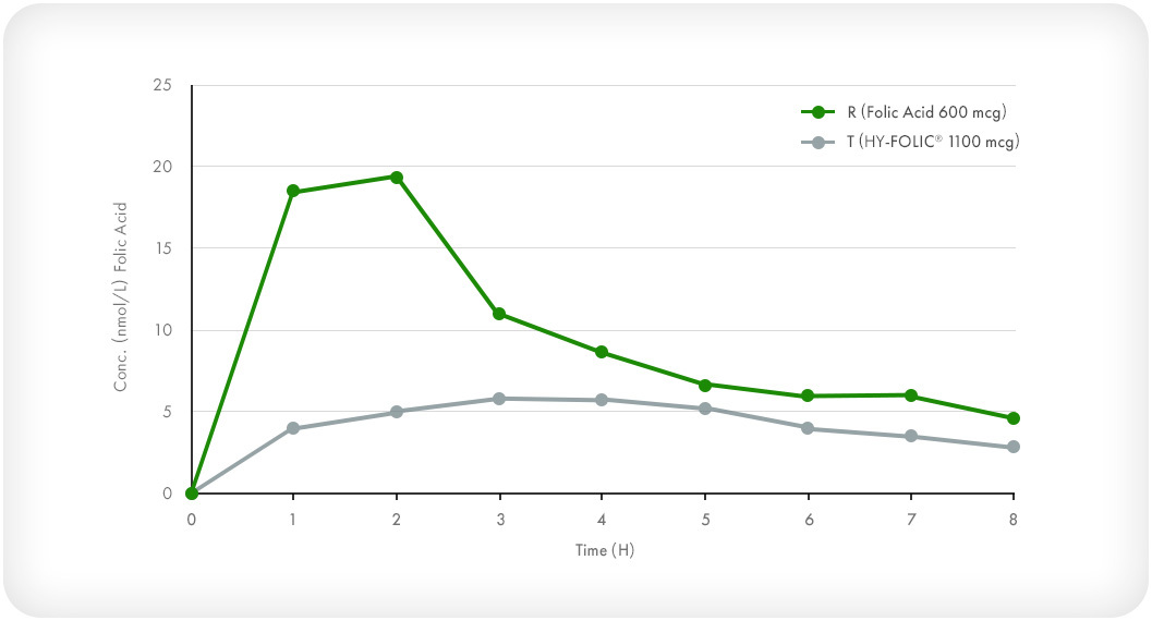 在 2024 年發表的最新人體臨床試驗更進一步證實 Quatrefolic® 在人體的利用率約為傳統葉酸的 2 倍;同時食用 Quatrefolic® 後,體內「未代謝葉酸 (UMFA)」的殘留量顯著較低,安全性更高[5]。