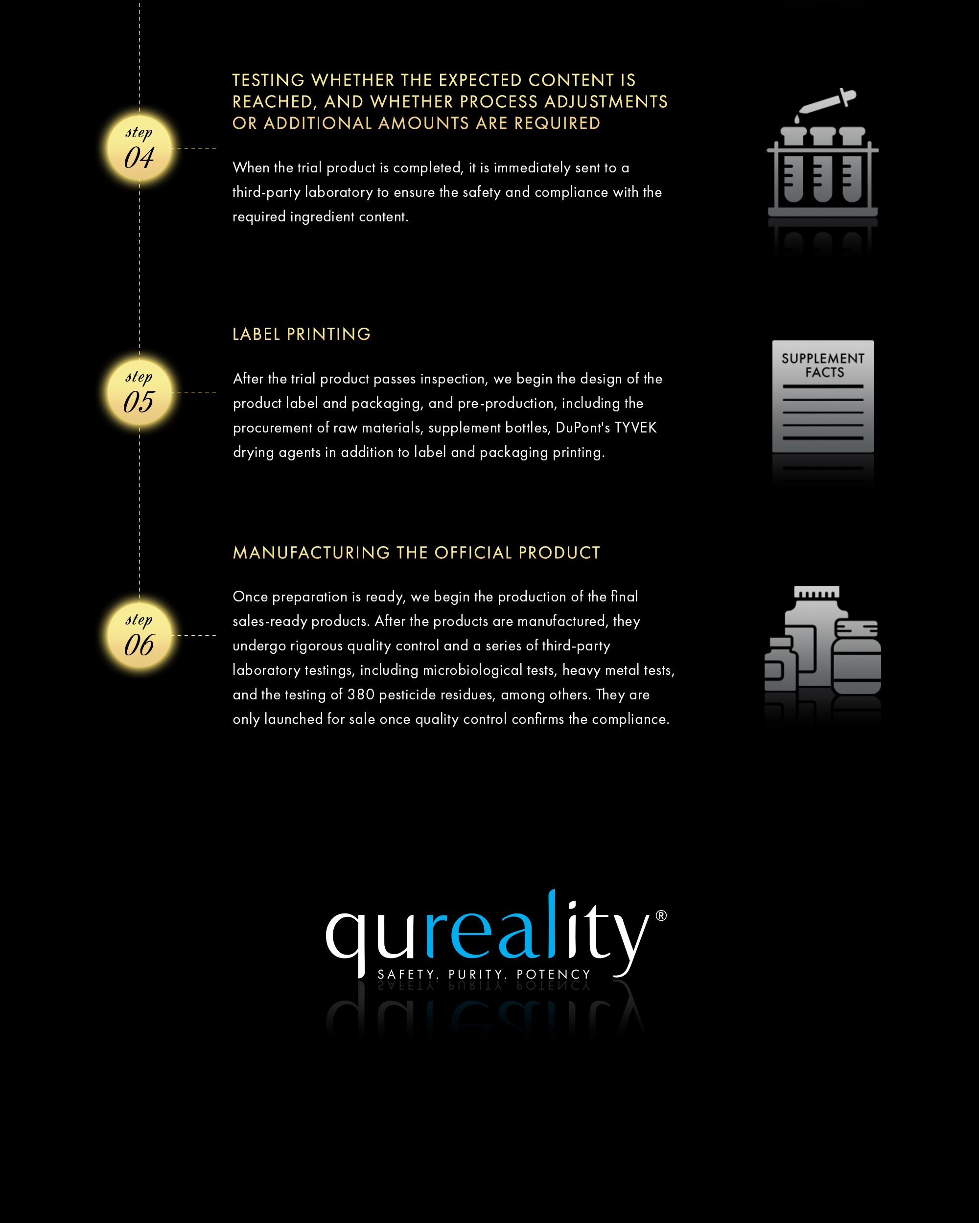In addition to the strength of our formulations, product quality is further ensured through high standards of manufacturing. We select different manufacturing facilities based on the specific characteristics of our products, ranging from Taiwan to Canada. Our product manufacturing processes adhere to extremely strict procedural specifications and safety standards, including ISO, GMP, and FDA-certified facilities in the United States.