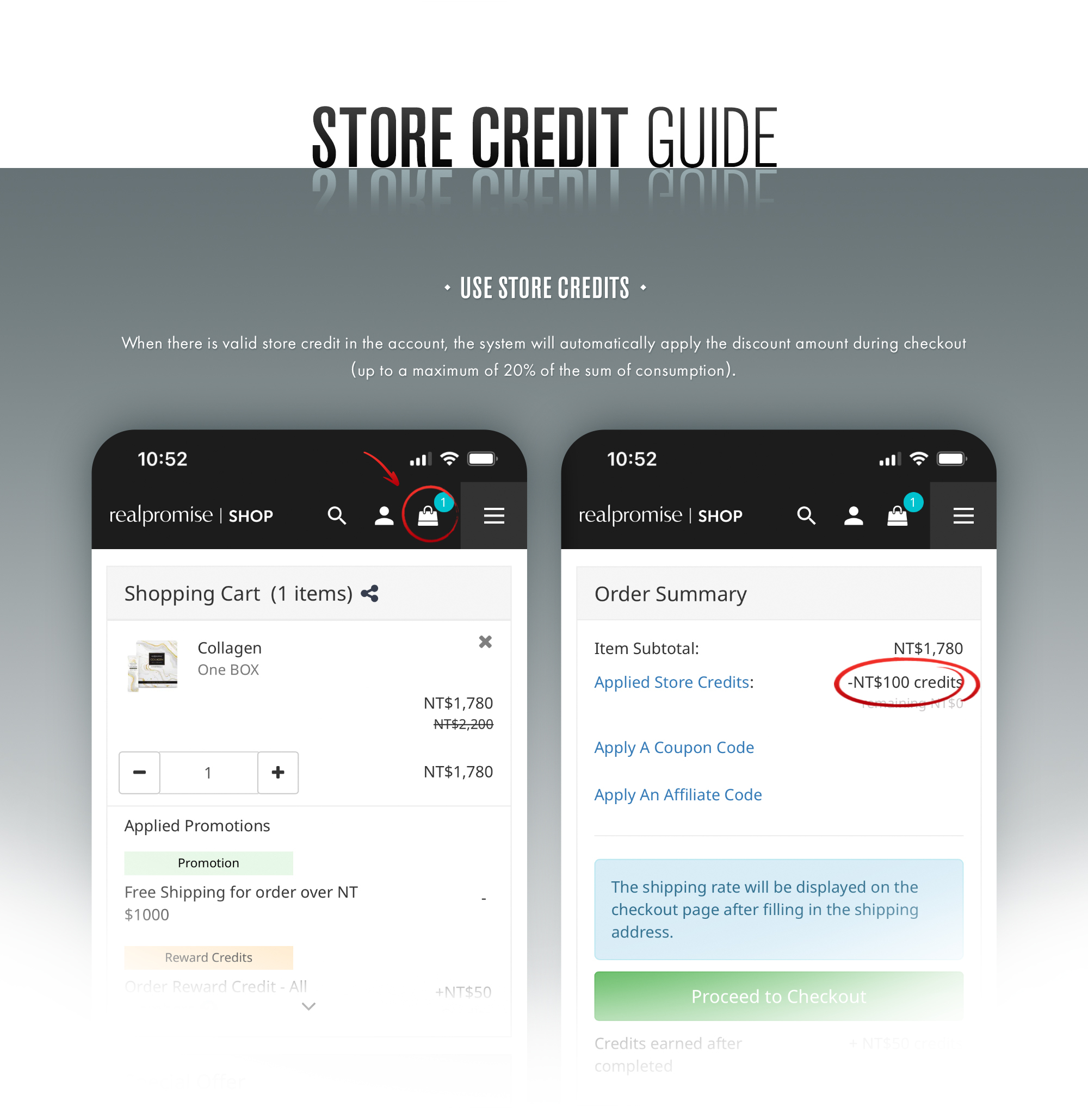 6. When members receive store credits, they can independently set the amount to be used as a discount on their orders. Store credits can be used as a discount for orders exceeding NT$1000, with a maximum of 20% of the sum of consumption.