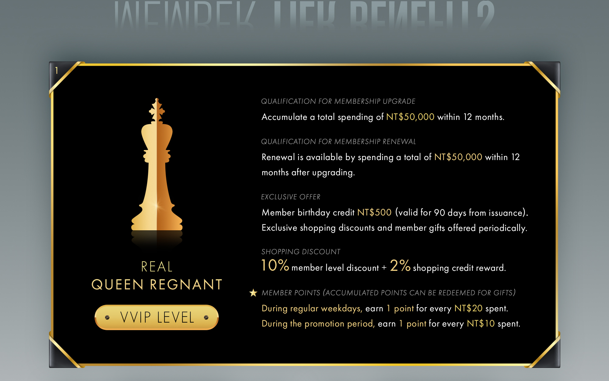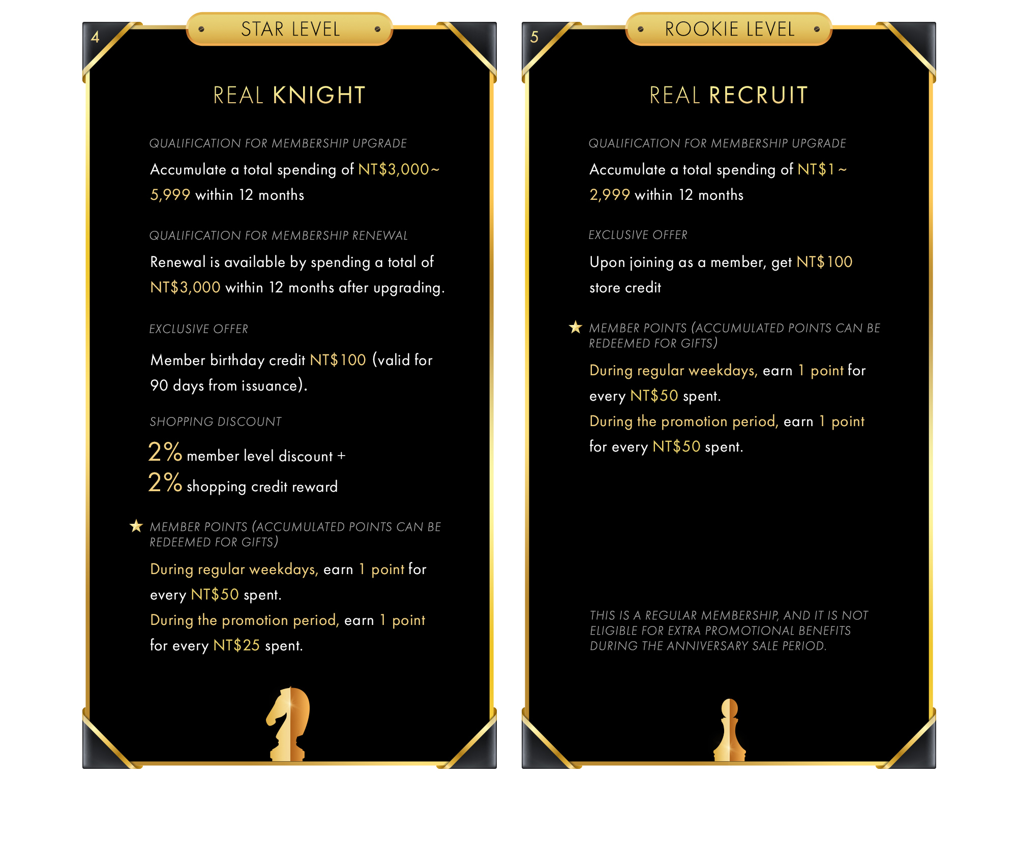 2. Accumulate a total spending of NT$3000, NT$6000, NT$10000or NT$50000 within 12 months to qualify for advancing your membership grade. After upgrading, you can enjoy exclusive discounts of 2% to 10% on your purchases for the next 12 months. These discounts are applicable instantly, and there is no limit to the discount amount.