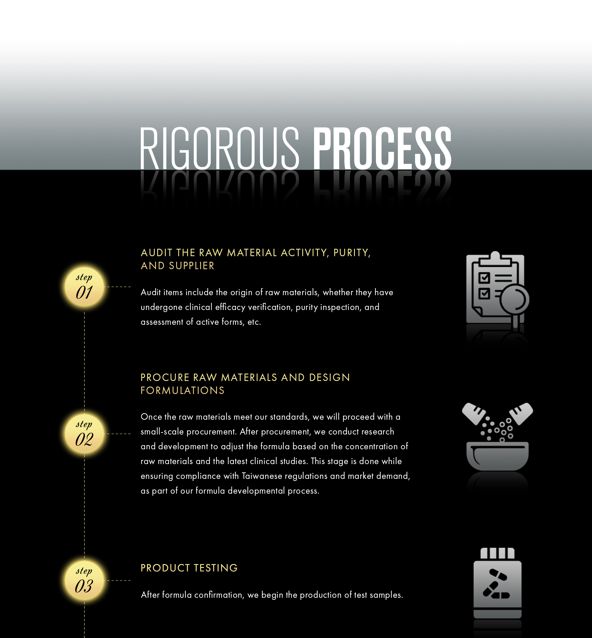 Quality, concentration, and purity are the cornerstones of nutritional supplements and the key to brand sustainability. We not only source high-quality certified raw materials that have passed scientific validation but also ensure that each batch of raw materials meets our strict quality standards. We do not cut corners to reduce costs, unlike many low-quality products that only add small amounts for flashy marketing claims. Cutting corners in ingredient sourcing ultimately compromises concentration and quality in clinical use, resulting in significantly reduced effectiveness.
