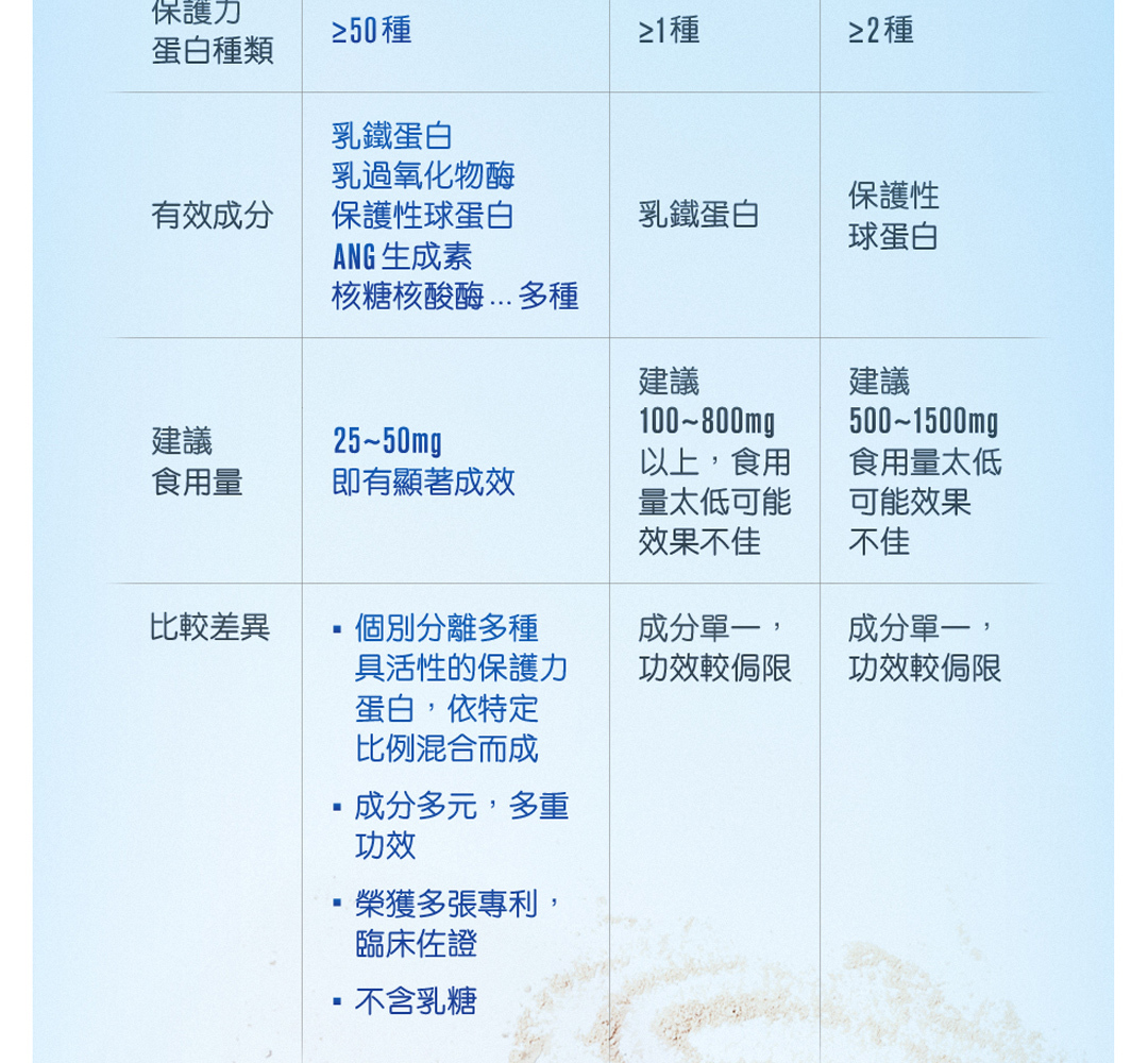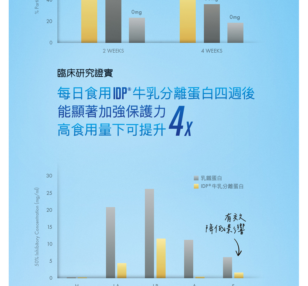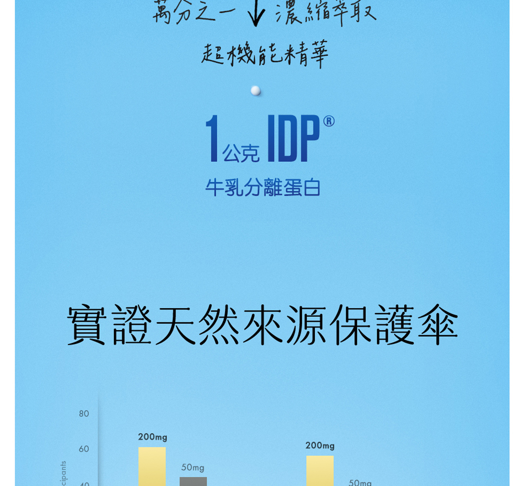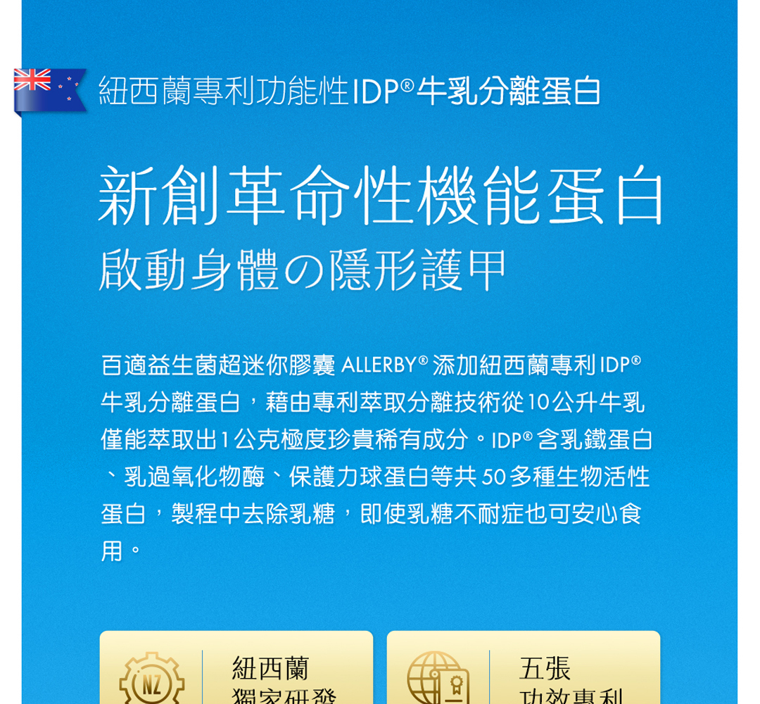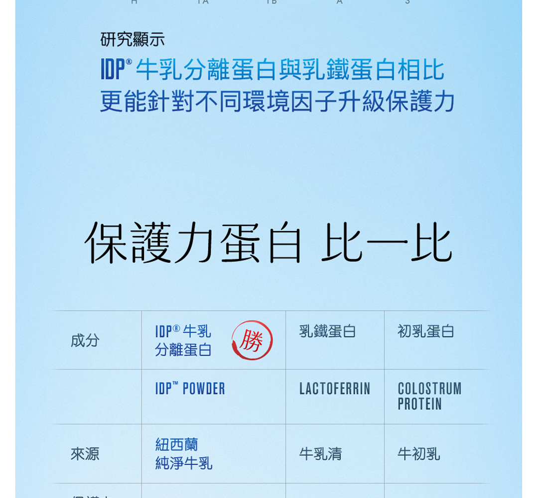 IDP® 牛乳分離蛋白擁有 5 張功效專利,以及多種認證及獎項。食用量少即可達到最佳的效果,比起乳鐵蛋白是更為全面性的選擇。無論對於是幼兒、學齡兒童、孕婦、成年人都可以支持提升對於環境的保護力。IDP® 牛乳分離蛋白製程中去除乳糖,即使乳糖不耐症也可安心食用。