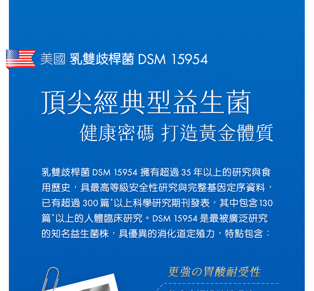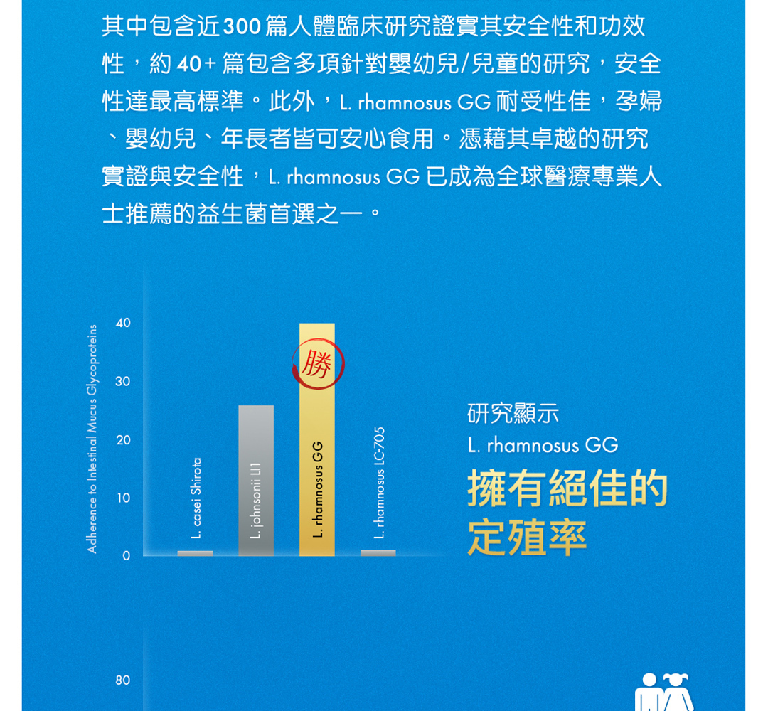 百適益生菌精選的鼠李糖乳桿菌 (Lactobacillus rhamnosus GG),又稱為 LGG;以及動物雙歧桿菌 (Bifidobacterium animalis DSM 15954),DSM15954 在研究上另一個別名是 BB12。百適益生菌這兩株菌產地美國,來自益生菌大廠 Danisco,並且有數十年的研究與食用歷史,是具有相當權威性的菌株,具有高度耐酸耐鹼性,超強定殖力,食用後長時間仍可檢測存活率。L. rhamnosus GG 不僅是國際益生菌和益生元科學協會 (International Scientific Association for Probiotics and Prebiotics,ISAPP) 所推薦經過研究證實對於兒童能有效增加保護力的驗證菌株。更是美國國家衛生研究院 (National Institutes of Health,NIH) 於網頁上明確介紹科學臨床實證效能的功能性指標菌株。