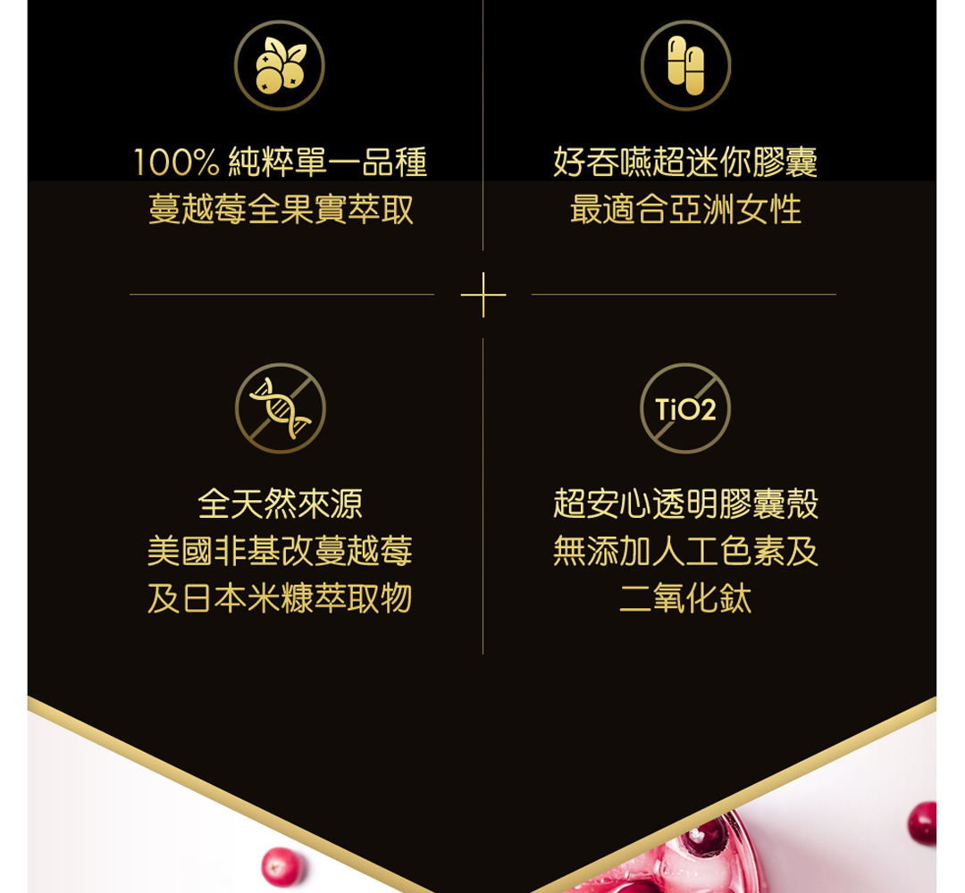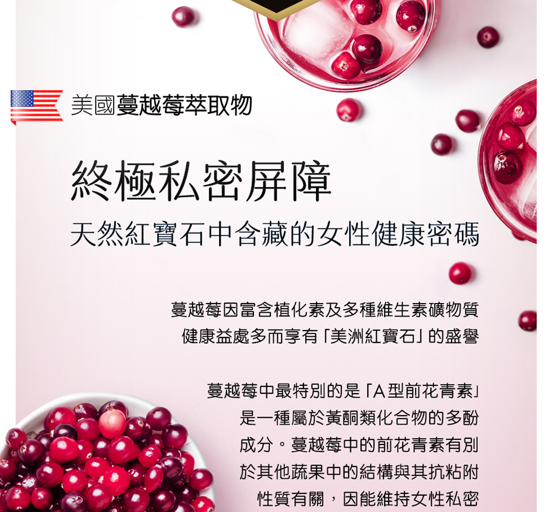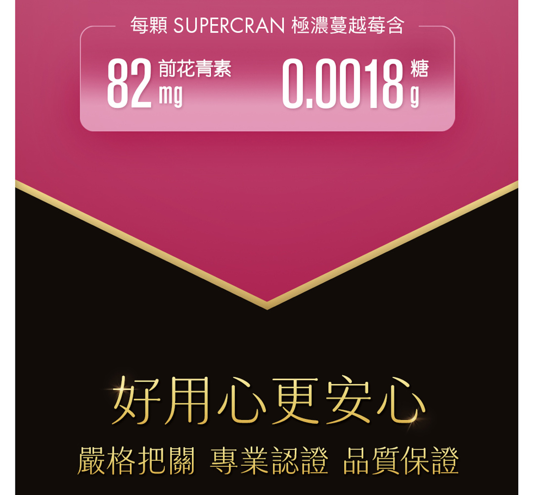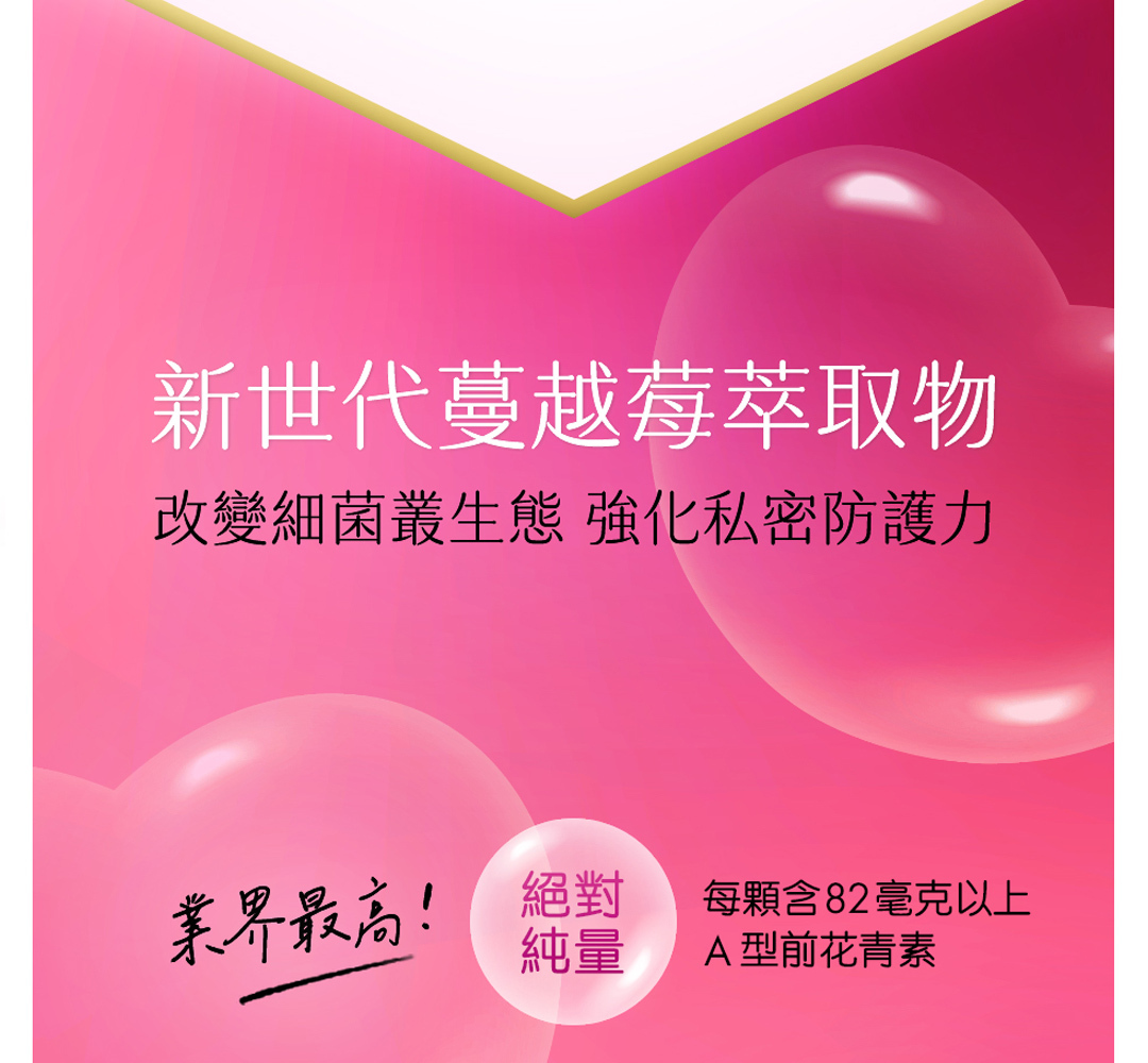 極濃蔓越莓超迷你膠囊精選頂規 68% 極濃縮蔓越莓,爆量添加 120 毫克,每顆含 82 毫克以上A型原花青素,挑戰市售蔓越莓膠囊單顆最高含量,適合女性私密保養。