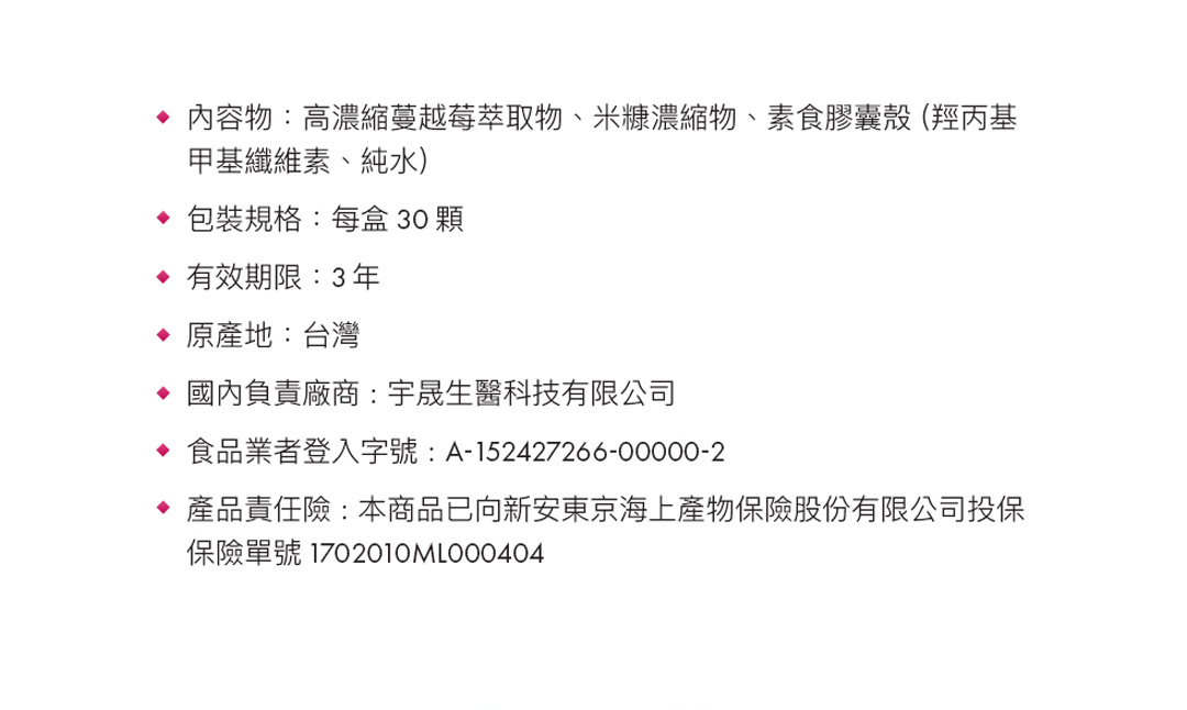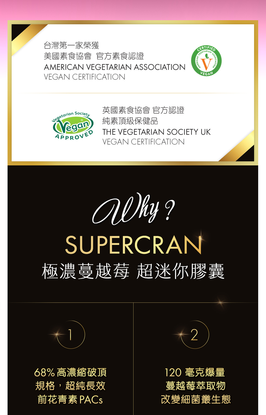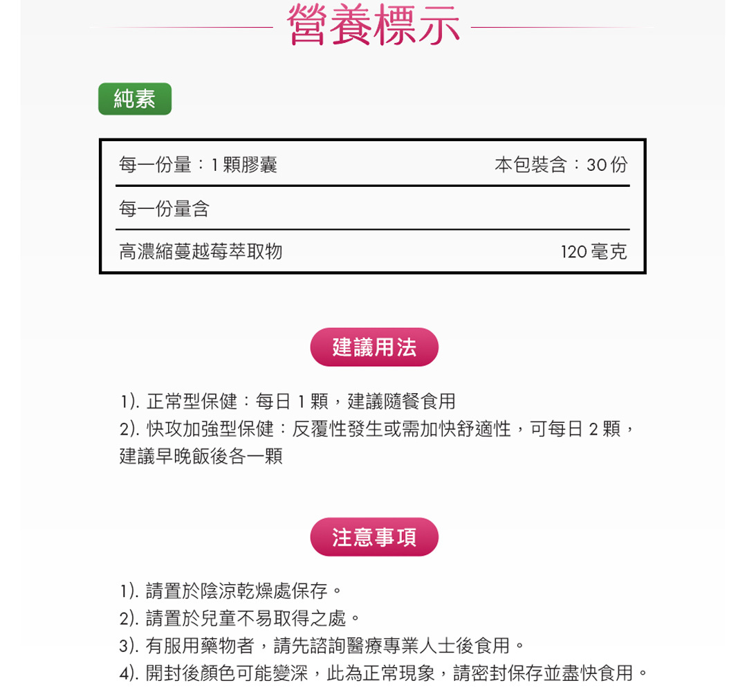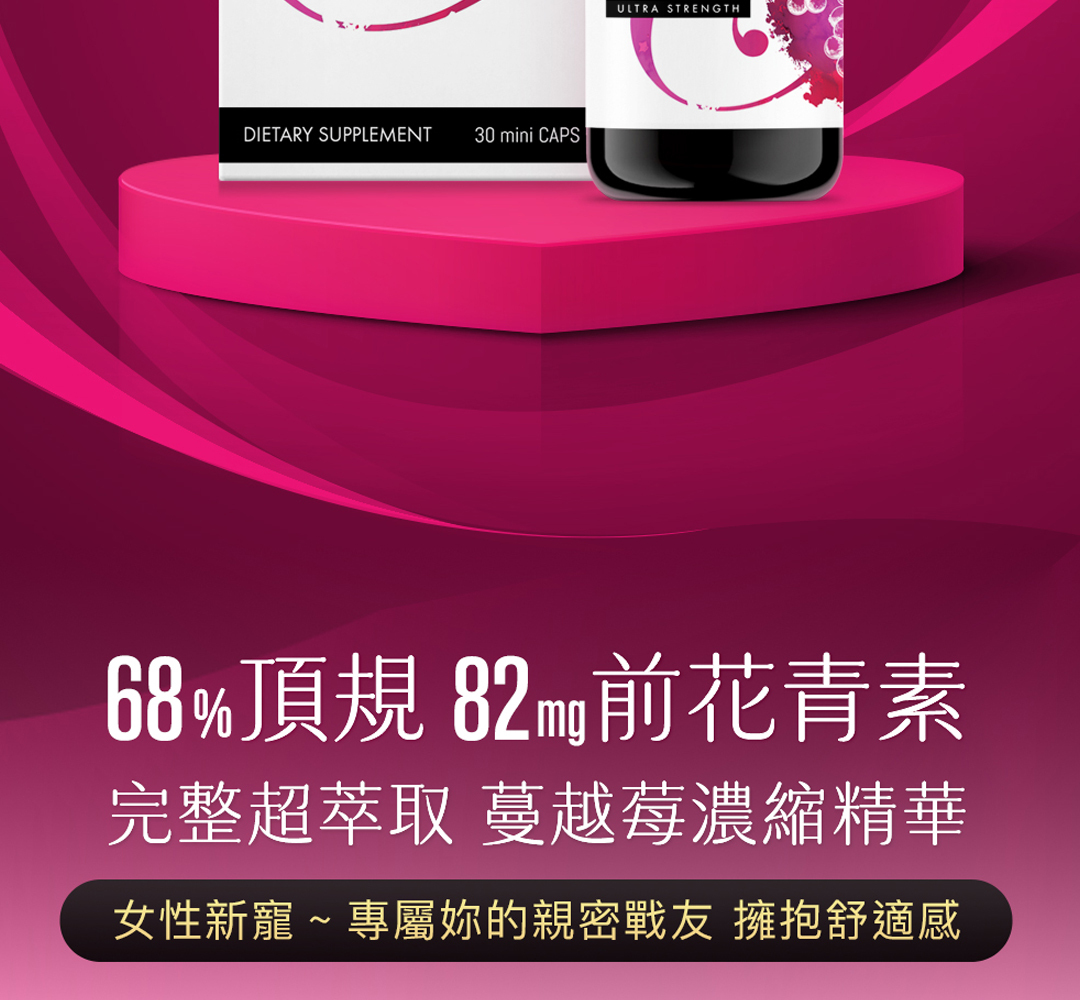極濃蔓越莓超迷你膠囊精選頂規 68% 極濃縮蔓越莓,爆量添加 120 毫克,每顆含 82 毫克以上A型原花青素,挑戰市售蔓越莓膠囊單顆最高含量,適合女性私密保養。