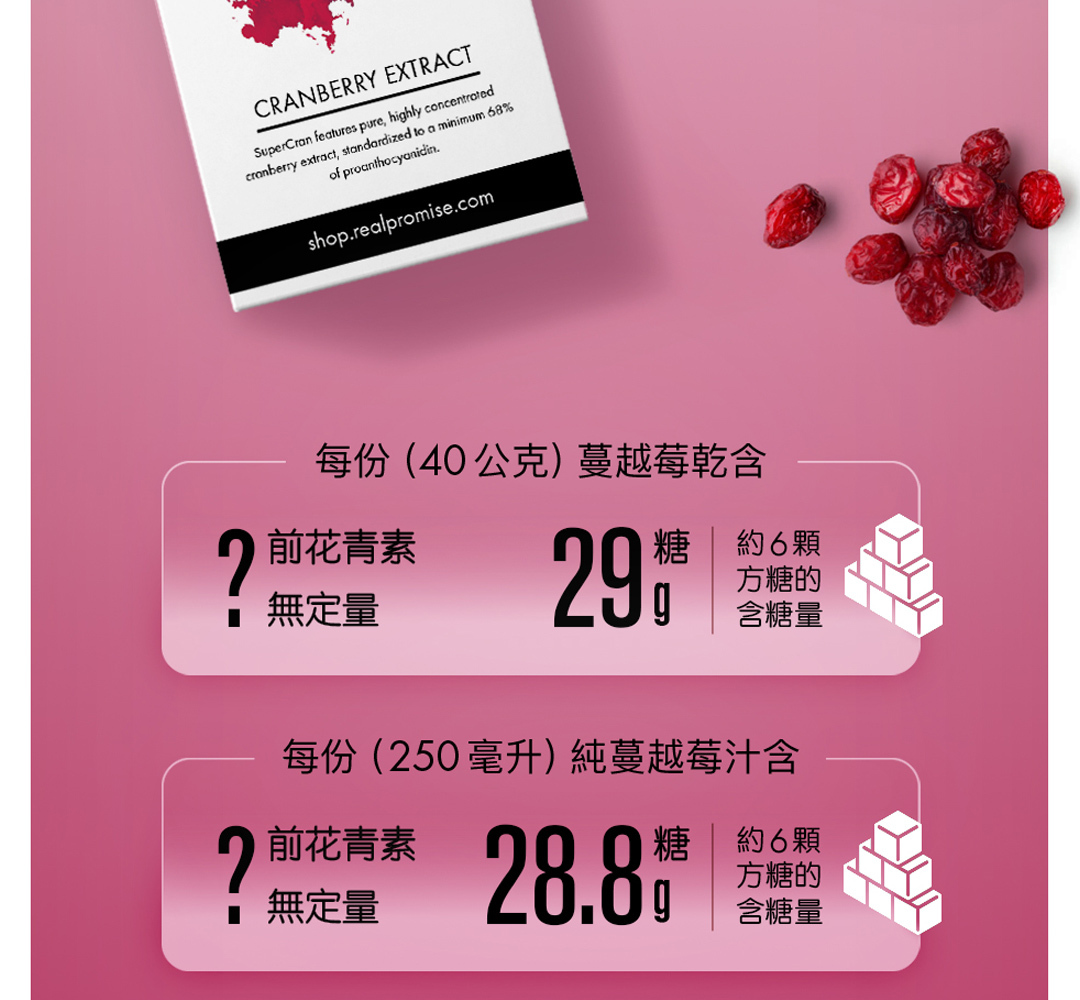 蔓越莓的成效取決於 A 型原花青素 (PACs) 的含量,A 型原花青素含量越高,成效越好。蔓越莓粉因為經過濃縮萃取,其活性成分一定比蔓越莓汁來的更高,尤其蔓越莓汁還含有糖分,食用上可能導致熱量攝取過多。