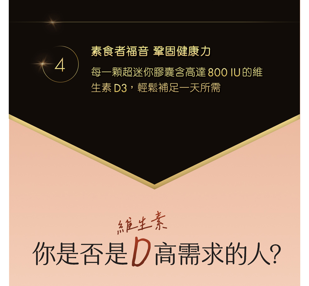 • 純素維生素 D3 超迷你膠囊精選植物性超迷你膠囊殼,不含人工色素與二氧化鈦,僅含植物纖維與純水,食用更安心。超迷你尺寸,即使銀髮族或兒童也可以輕易吞嚥。