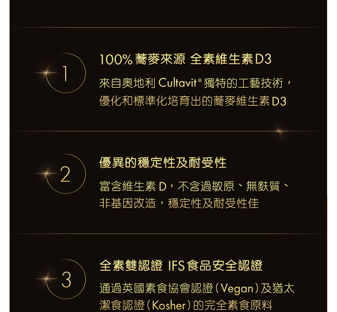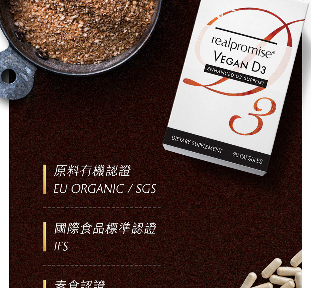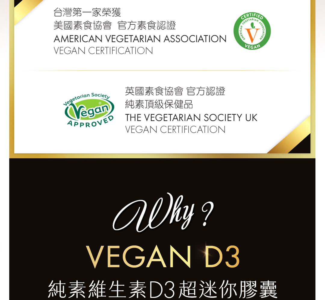• 市售唯一英美雙認證,經過美國素食協會與英國素食協會雙認證的頂級維生素 D3 補充品