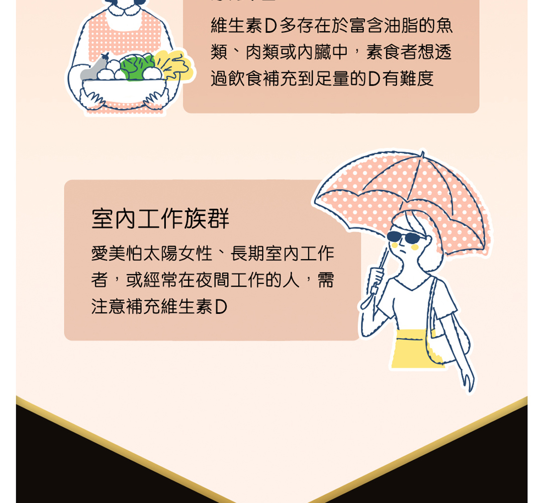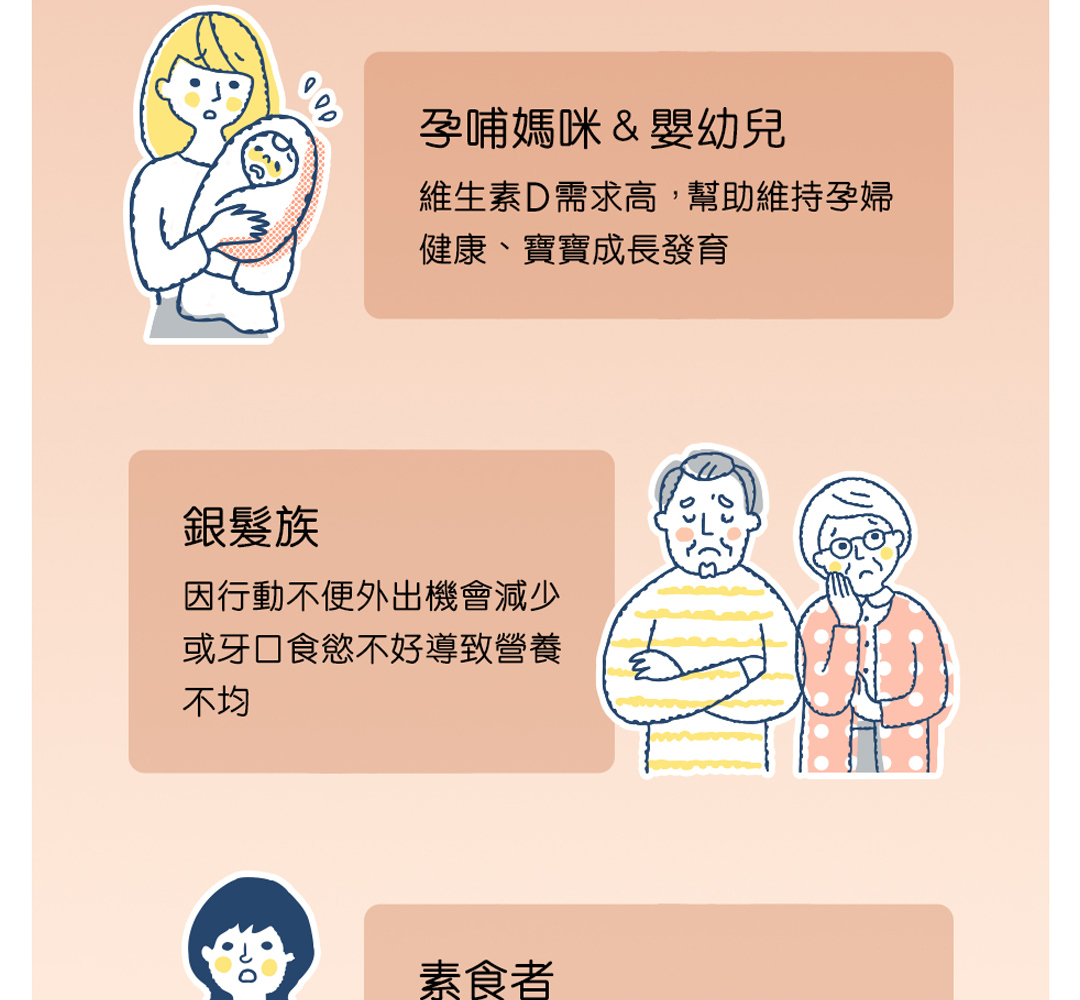 • 懷孕與哺乳:孕媽咪與哺乳媽媽皆需充足維生素 D 支持寶寶需求