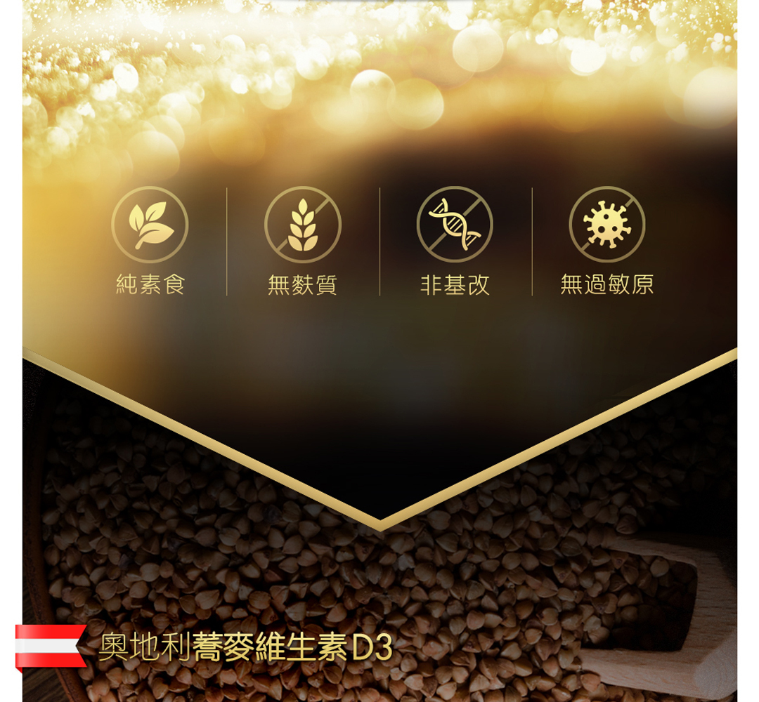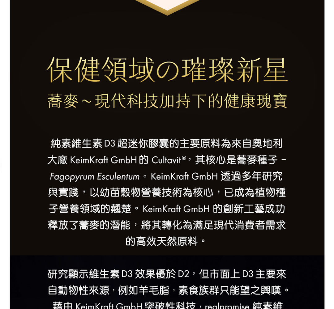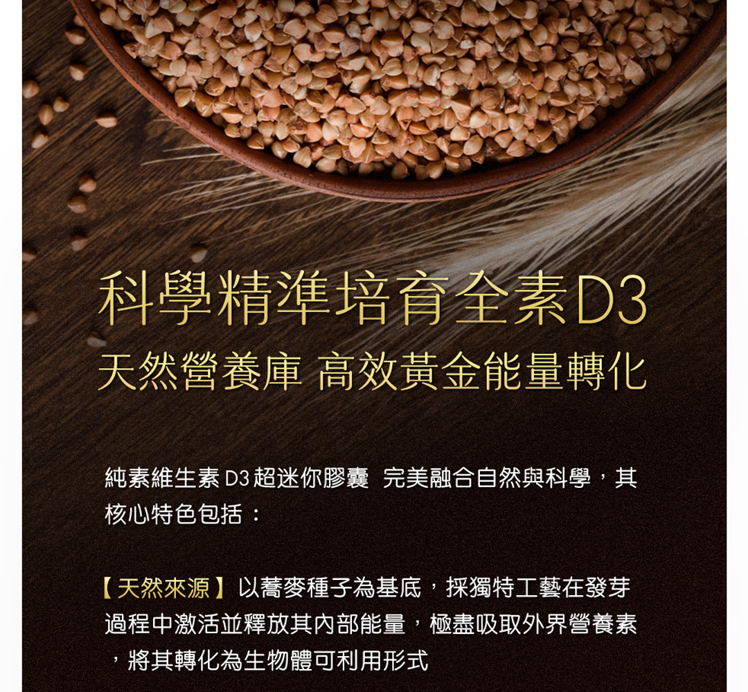• 市售維生素 D3 許多來自於羊毛脂萃取,非植物性來源。純素維生素 D3 超迷你膠囊源自奧地利天然蕎麥的植萃精華營養素,非動物性來源,素食可食,更為永續環保。