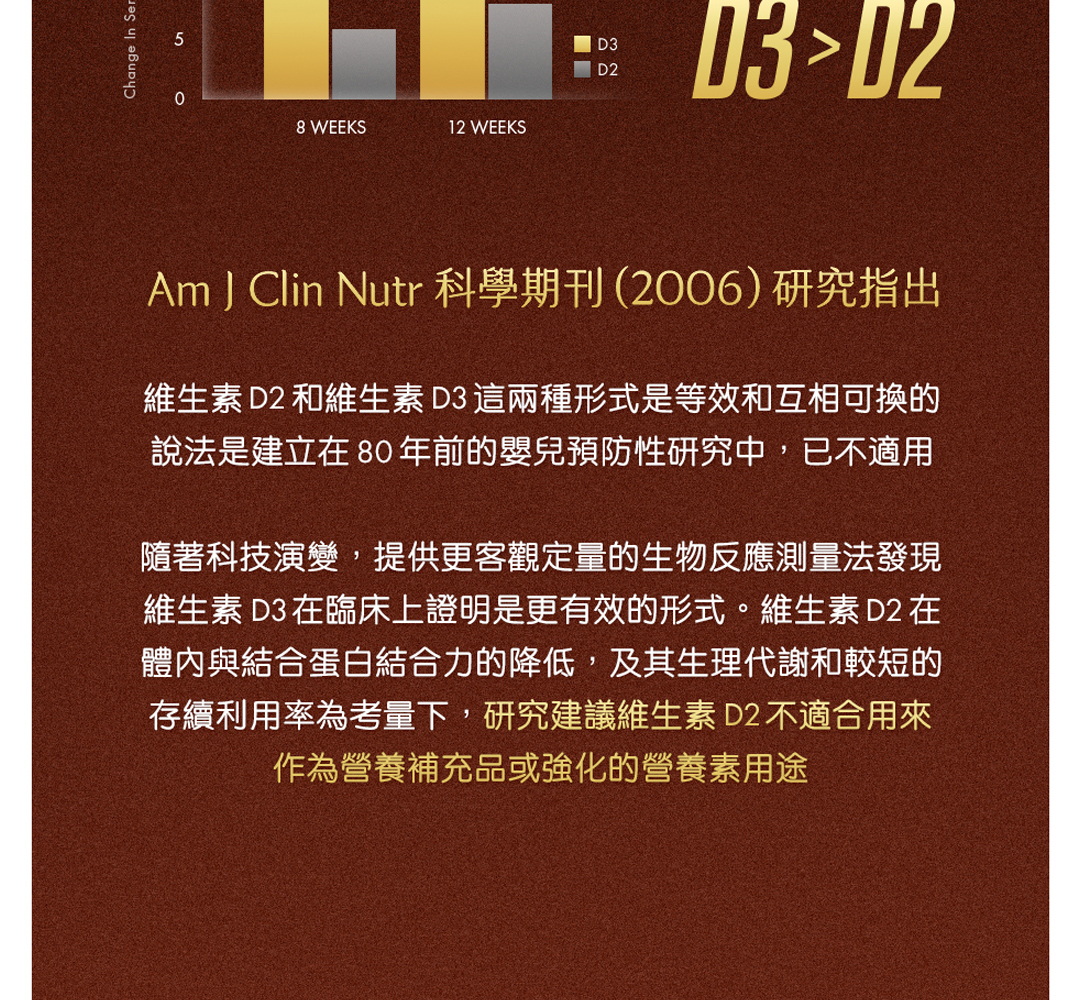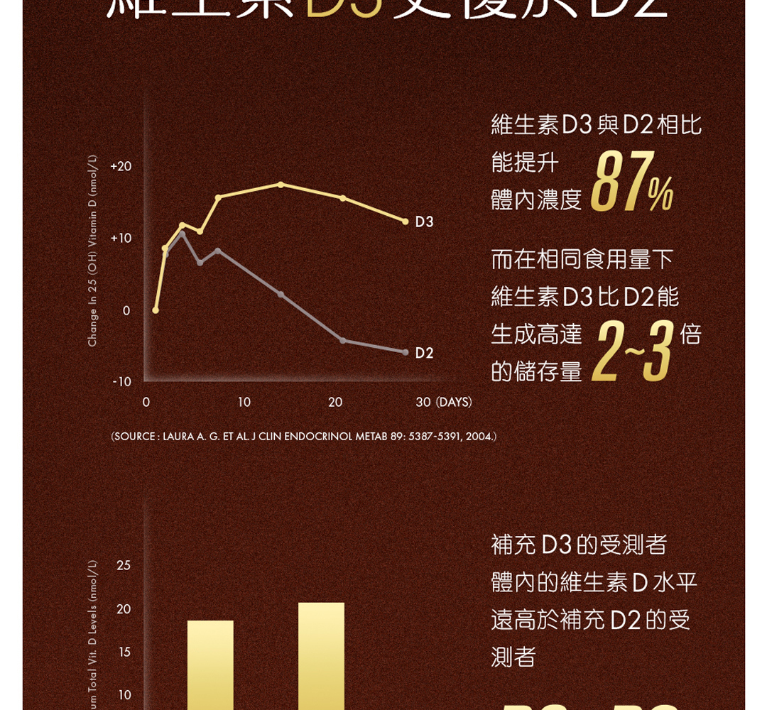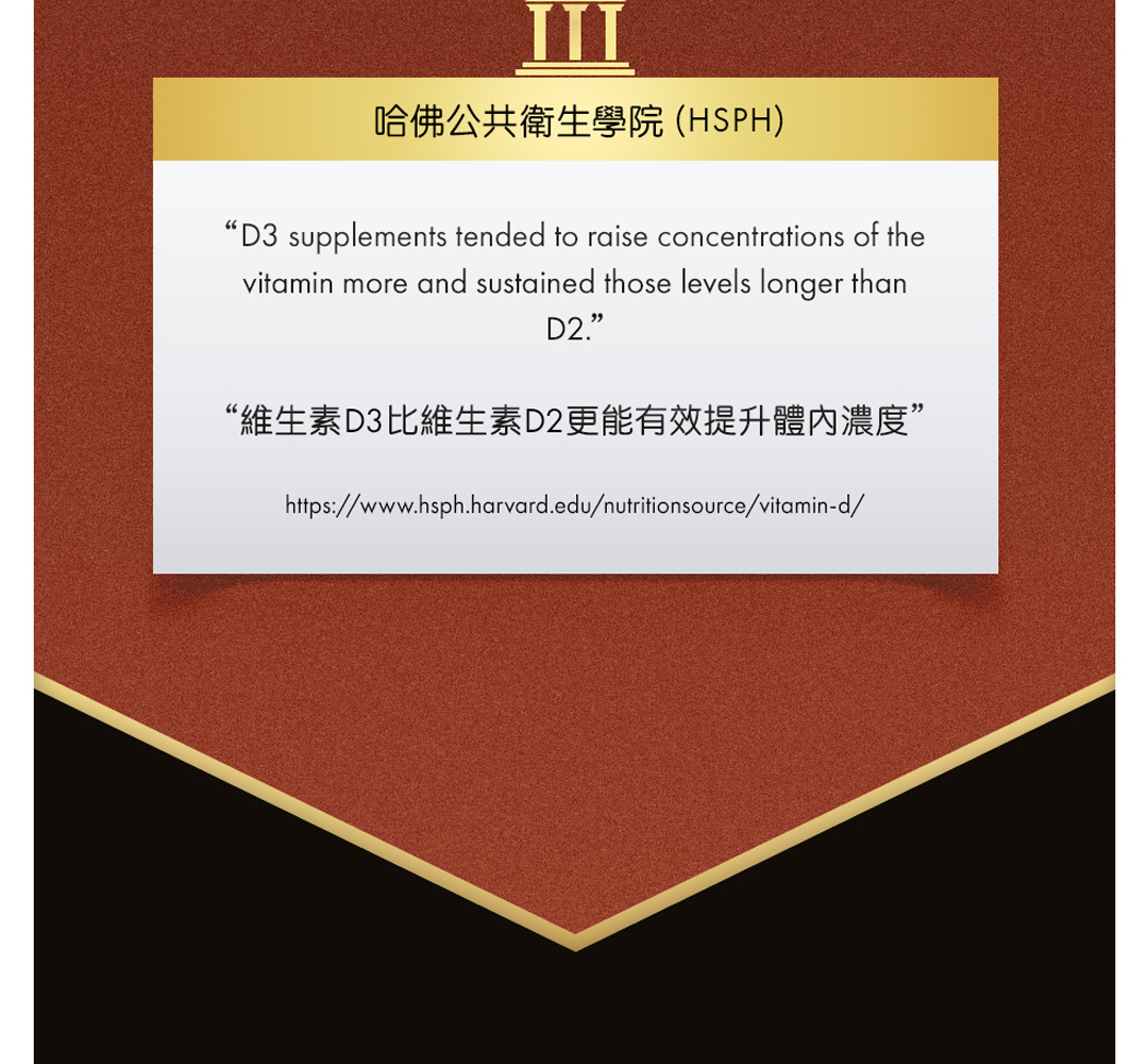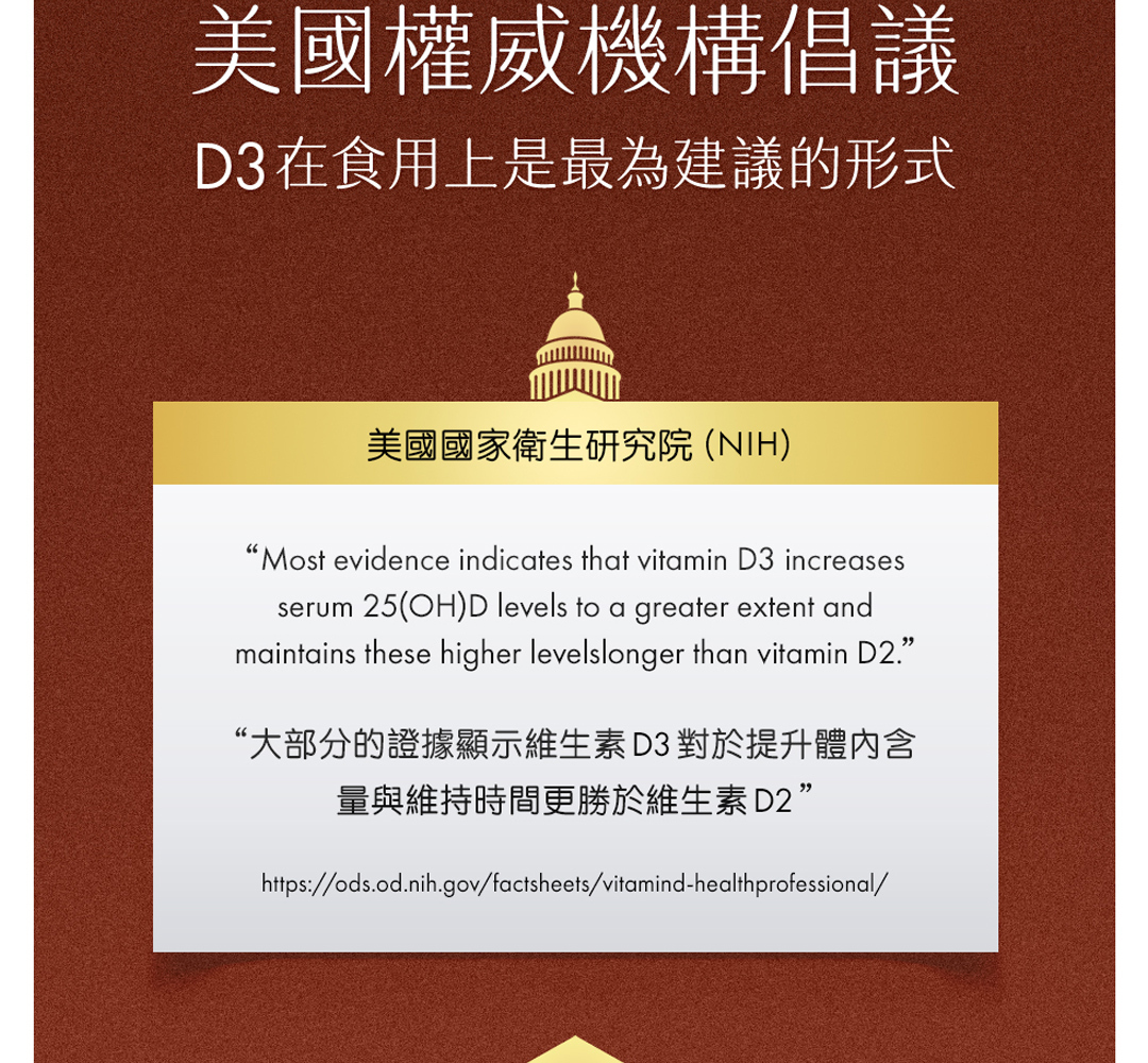 維生素 D3 一般比 D2 來的更穩定,並且具有更高的吸收率,也能在體內作用較長的時間。維生素 D3 也是歐美各國主流的維生素 D 使用形式,具有良好、安全、健康的效益,是補充維生素 D 的首選型態。