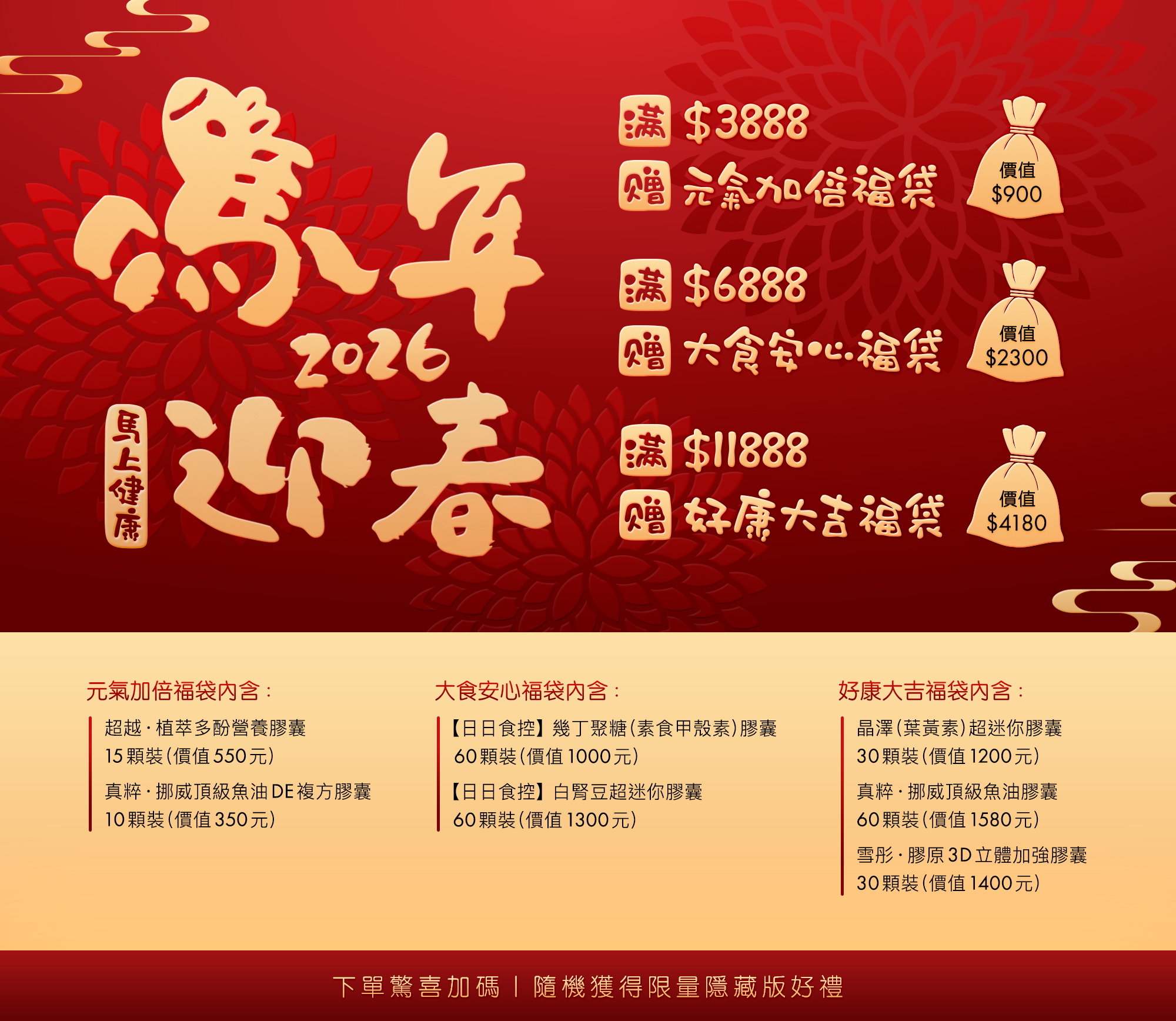活動期間內,單筆訂單消費達指定門檻,即可獲得對應級距之「新年福袋」乙份,並有機會隨機加碼獲得限量隱藏版好禮。贈品數量有限,送完即止,活動將提前結束。