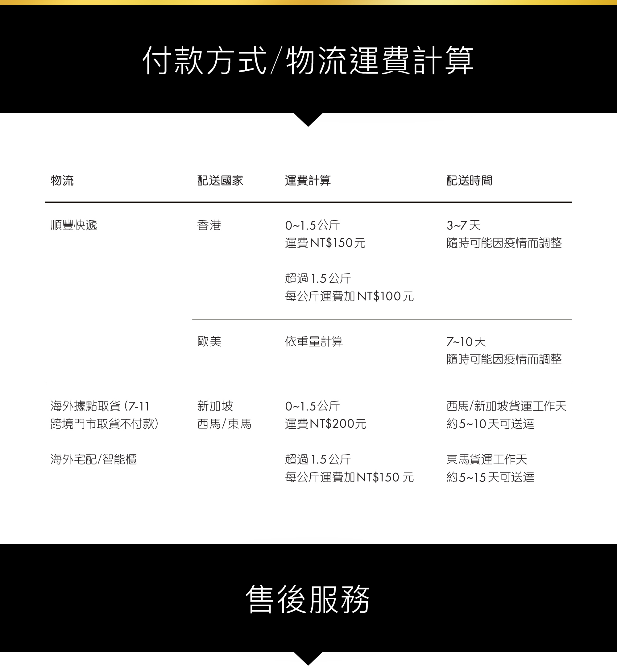 2. 商品配送運費計算依照包裹重量計算,提醒您,海外據點取貨有重量限制,建議包裹重量在 4 公斤以內,超過請分開訂購,謝謝您。