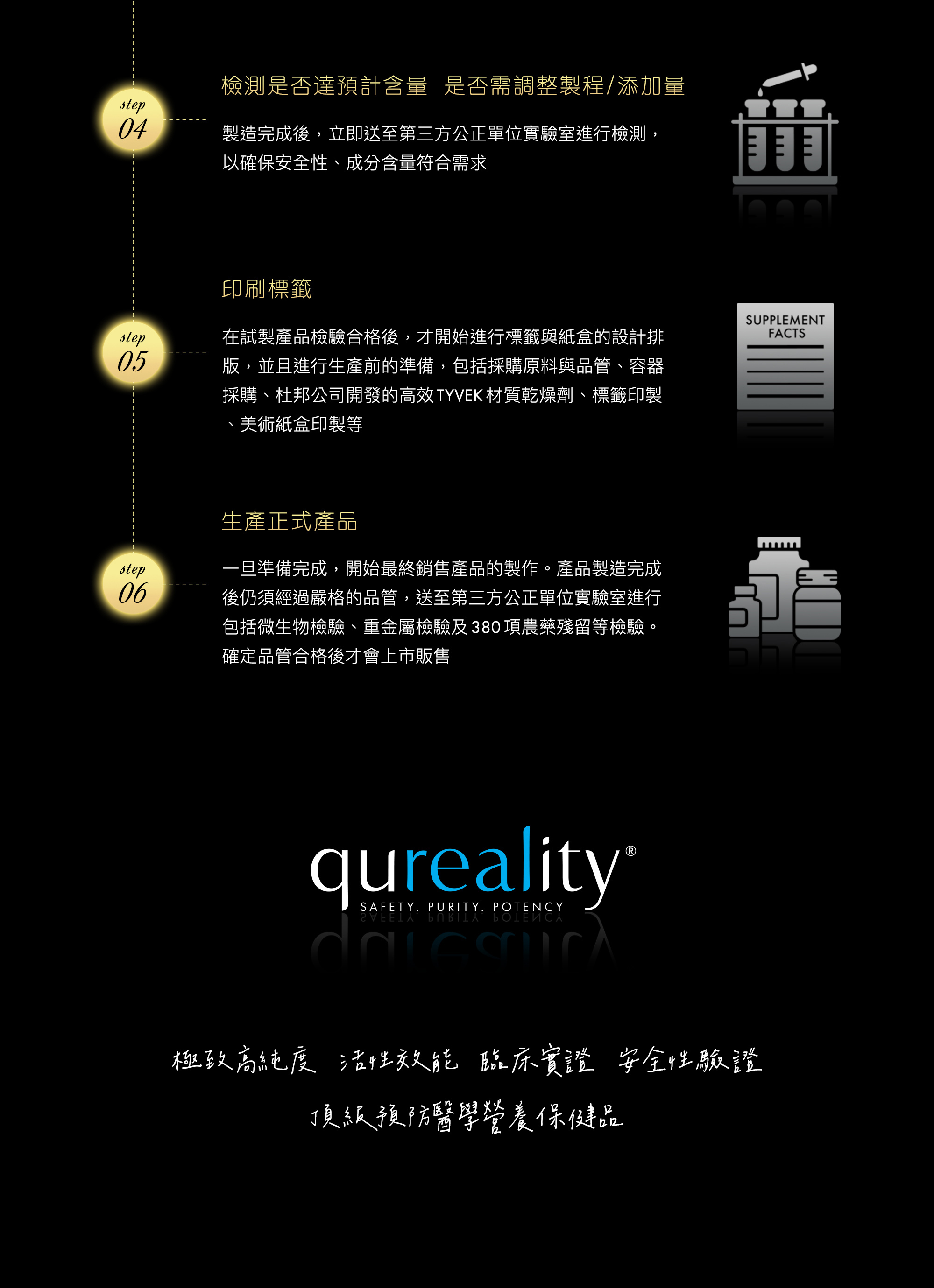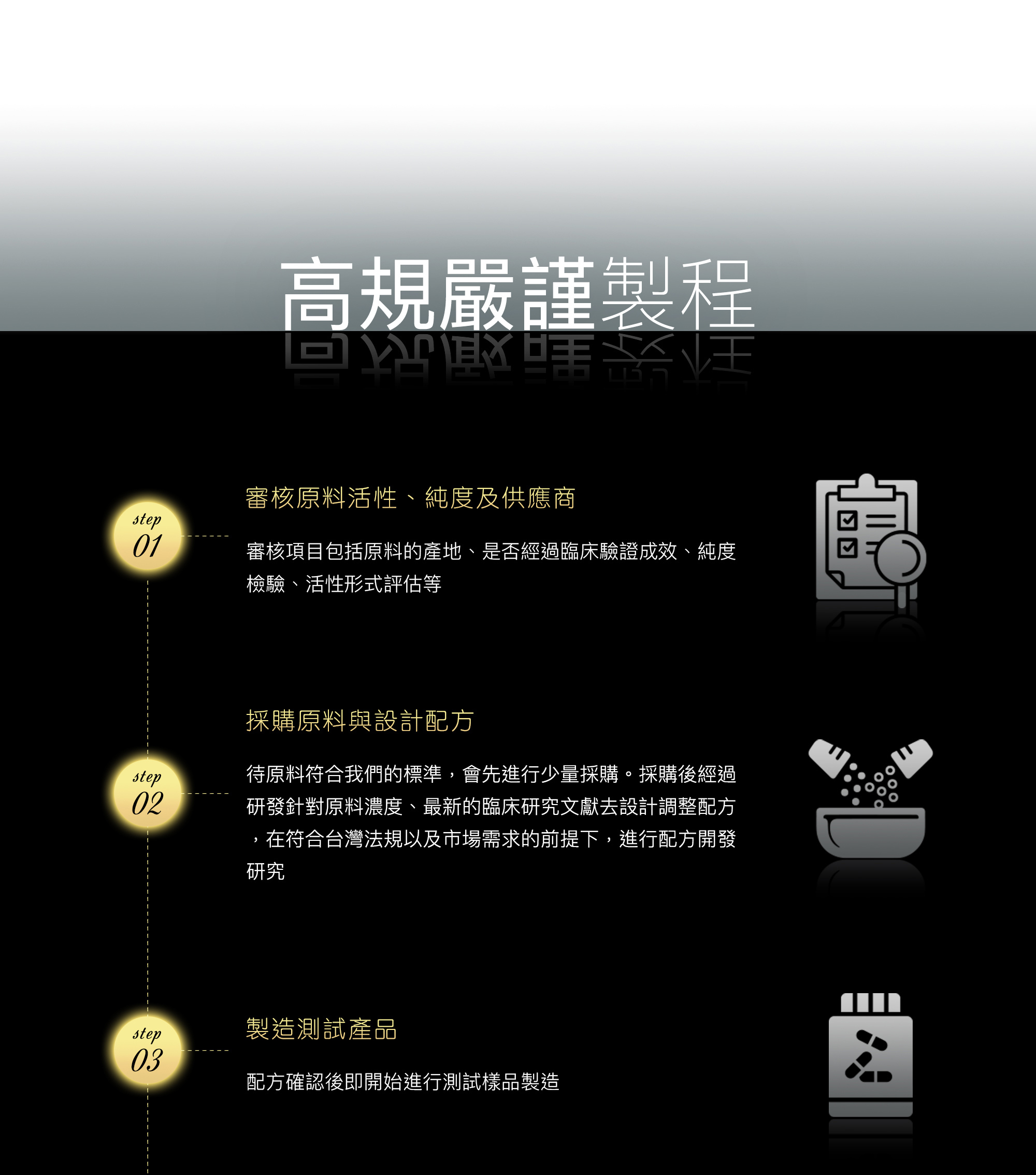 品質、濃度與純度是營養品的信賴基石,亦是品牌永續的關鍵;我們不僅採購優質通過科學驗證的認證原料,同時確認每批原料皆符合我們嚴格規範的品質。我們不會為了降低成本而節省用料,不似許多劣質商品,僅添加少量來作為行銷花俏的宣稱。因為節省用料將無法達成臨床上的濃度與品質,最終只會導致食用效果大打折扣。
