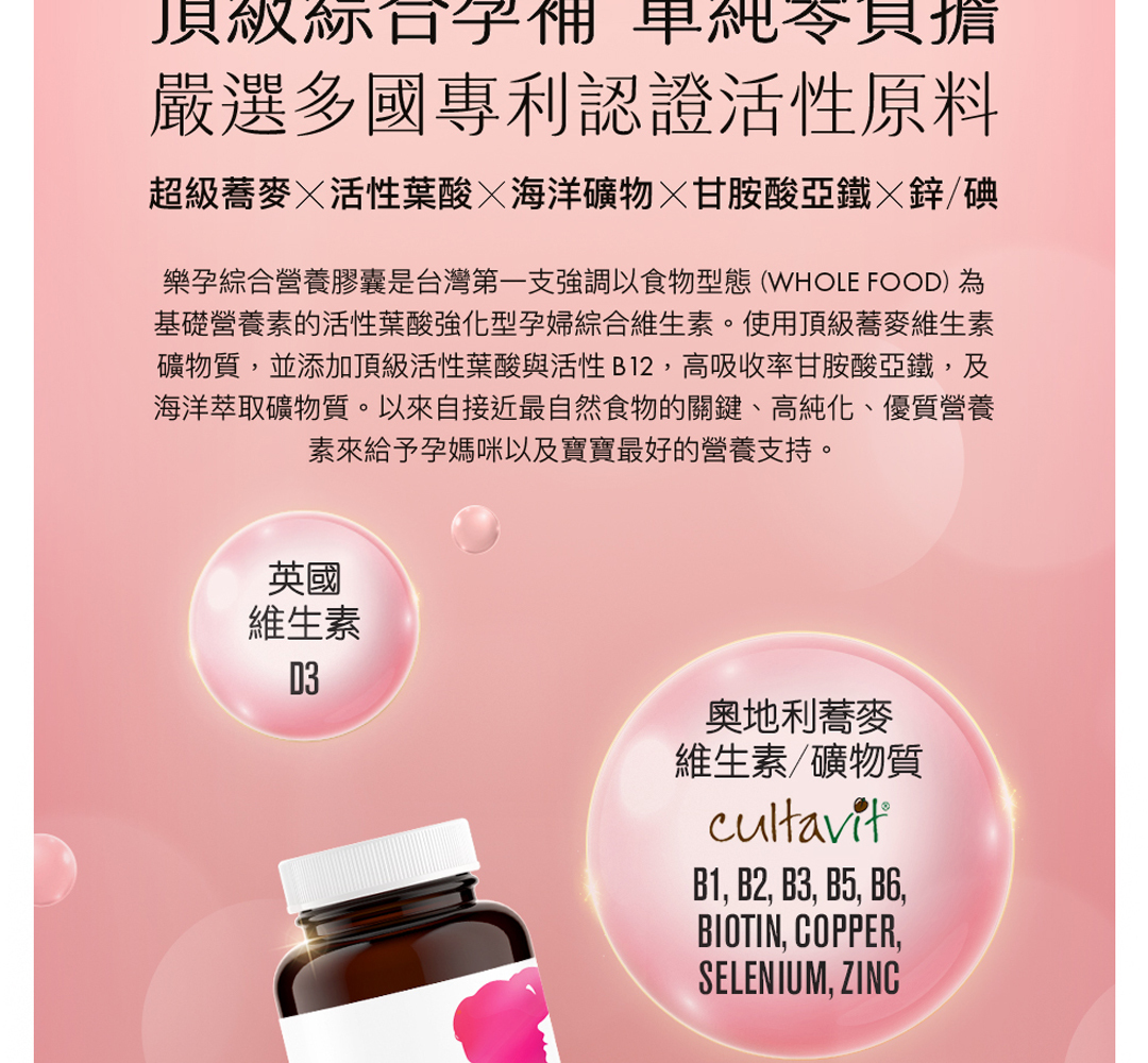 樂孕綜合營養膠囊是針對台灣孕媽咪研發的頂級全孕期綜合維他命,適合備孕、全孕期及哺乳期補充。樂孕由台灣專業營養團隊精心研製,是台灣唯一榮獲多項國際大獎認證頂級孕期維他命,包含英國美國素食協會雙認證、歐洲 Monde Selection 世界品質評鑑大賞 5 項特金獎大獎;更從 3000 多項競賽品中脫穎而出,獲得評審團一致肯定,榮獲罕見的 2024 Monde Selection 年度評審團大獎入選榮耀。樂孕綜合維他命是您孕期最佳首選保健品。