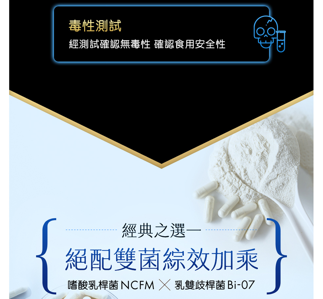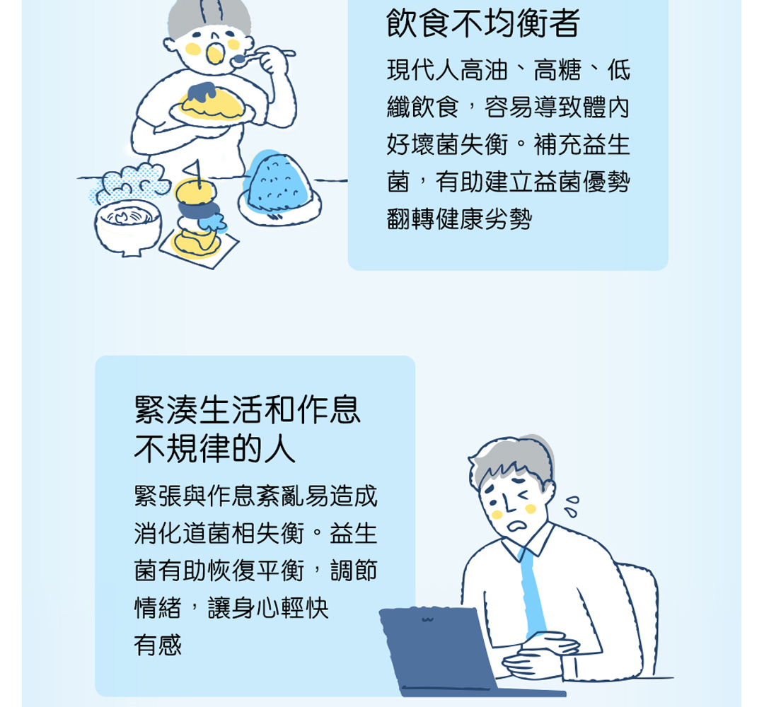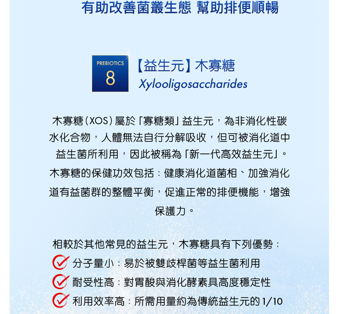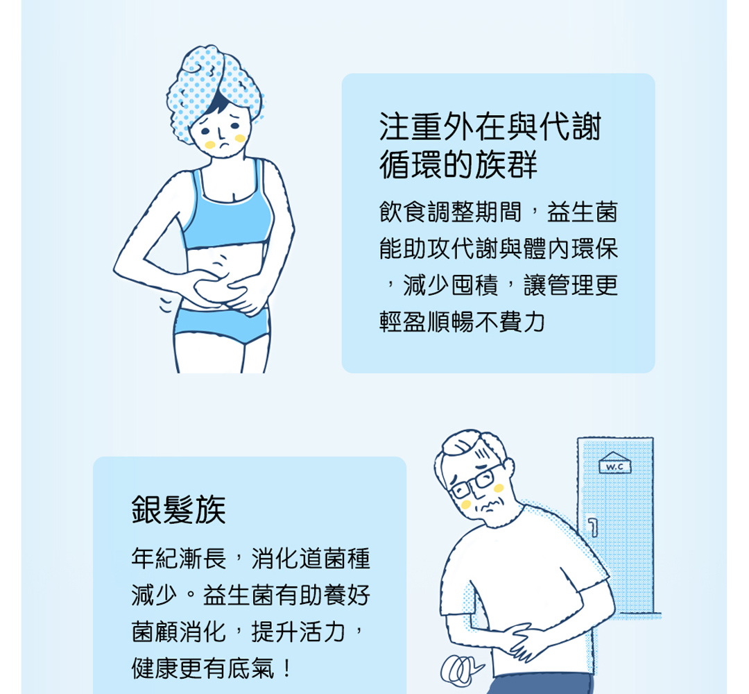 這些菌株搭配益生元木寡糖,能提供全方位的健康照護,完整提升消化道機能與健康。而這些菌株也適合各年齡層補充。