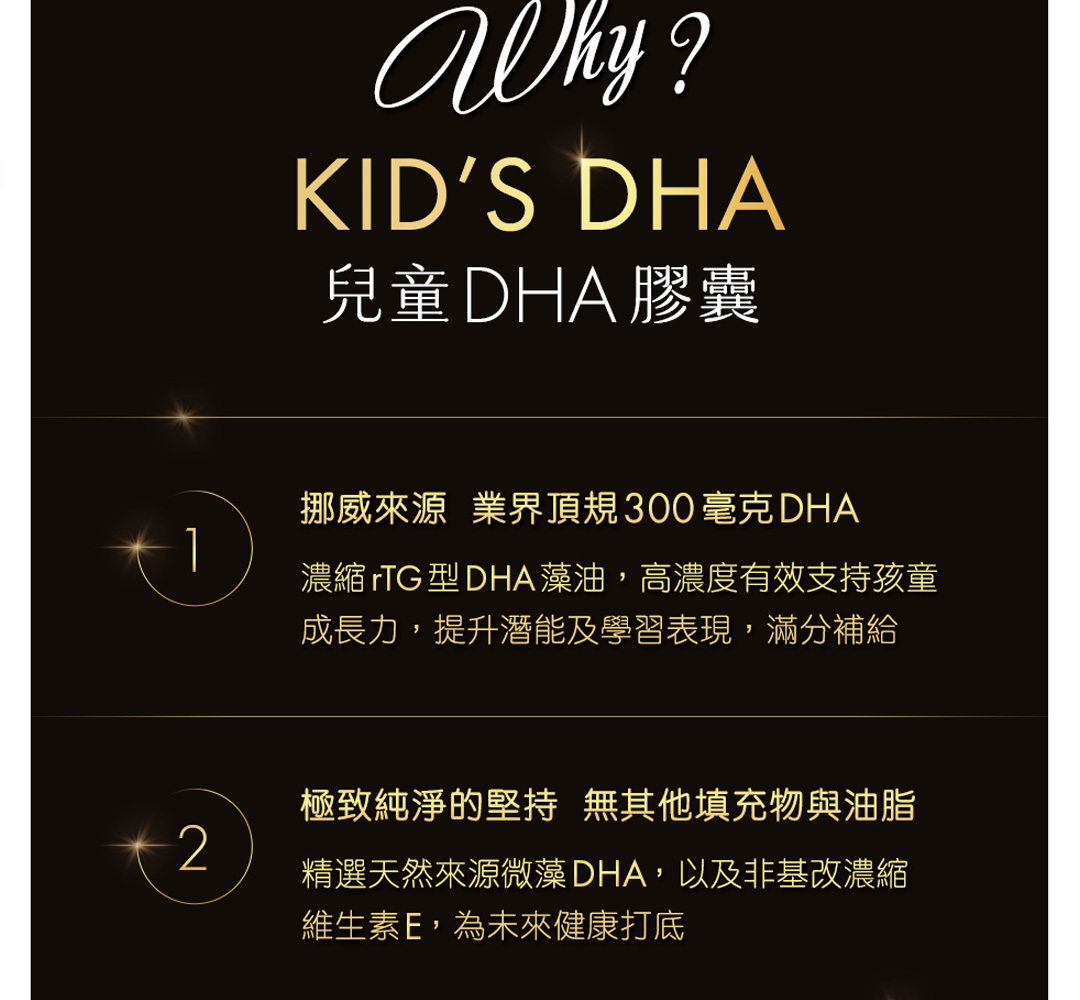 由於 DHA 人體並無法自行合成,但 DHA 對於兒童的學習力、反應力與發展扮演著關鍵的角色,所以會建議經由高品質營養保健品來額外補充,食用成效更快,並且能有效補足每日所需。