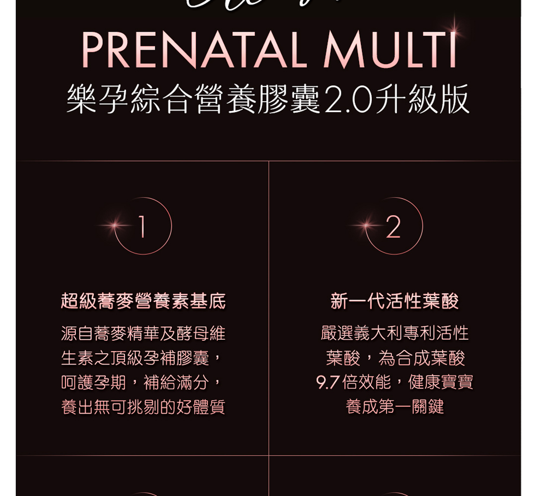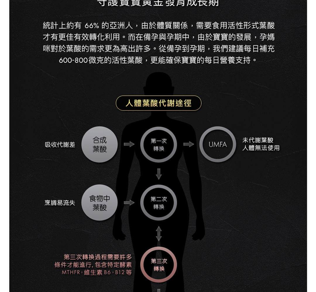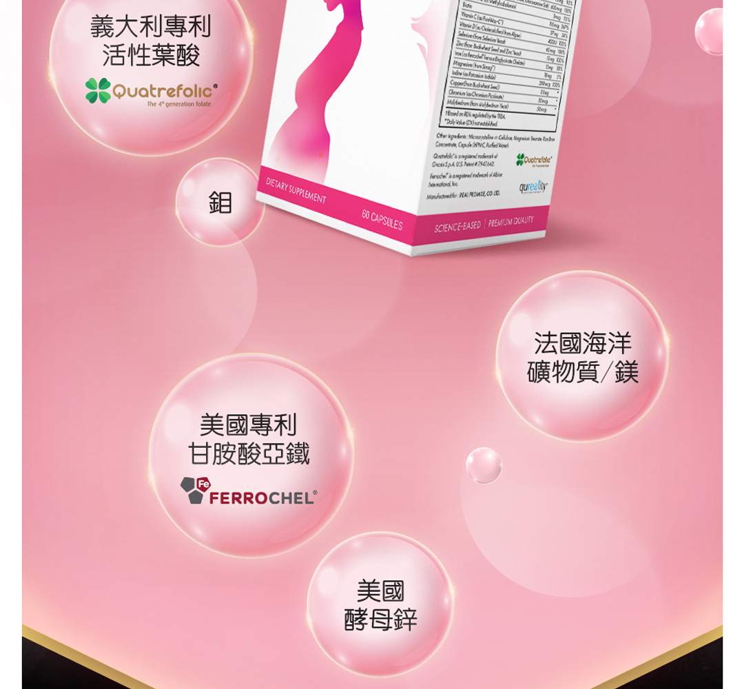 • 每日 2 顆含有 600 微克足量活性葉酸,符合衛福部每日建議攝取量,滿足胎兒需求