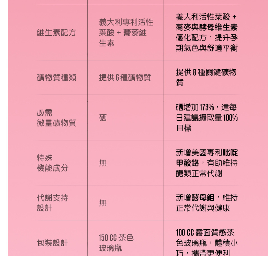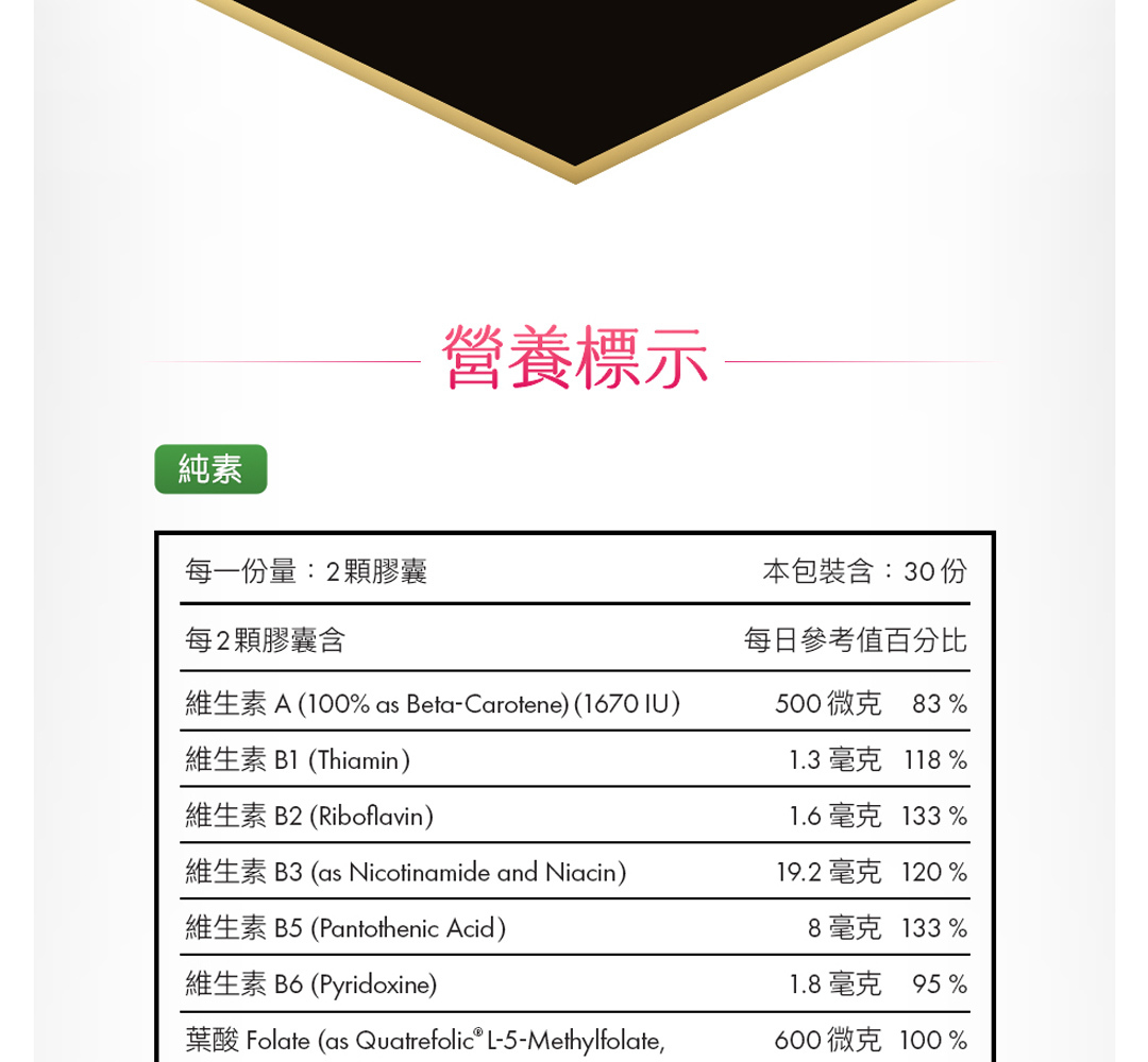 | 1. 成分完整與含量足夠 | 是否含有關鍵成分如:活性葉酸 (至少 600mcg)、鐵 (15mg)、維生素 D、碘 等。是否選用天然來源營養素,而非化學合成。 |