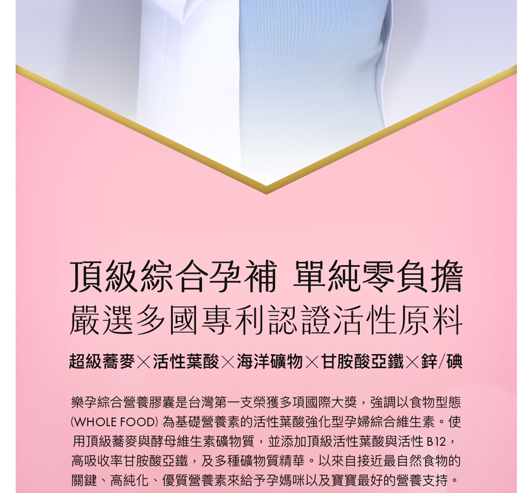 樂孕綜合營養膠囊是針對台灣孕媽咪研發的頂級全孕期綜合維他命,適合備孕、全孕期及哺乳期補充。樂孕由台灣專業營養團隊精心研製,是台灣唯一榮獲多項國際大獎認證頂級孕期維他命,包含英國美國素食協會雙認證、歐洲 Monde Selection 世界品質評鑑大賞 5 項特金獎大獎;更從 3000 多項競賽品中脫穎而出,獲得評審團一致肯定,榮獲罕見的 2024 Monde Selection 年度評審團大獎入選榮耀。樂孕綜合維他命是您孕期最佳首選保健品。