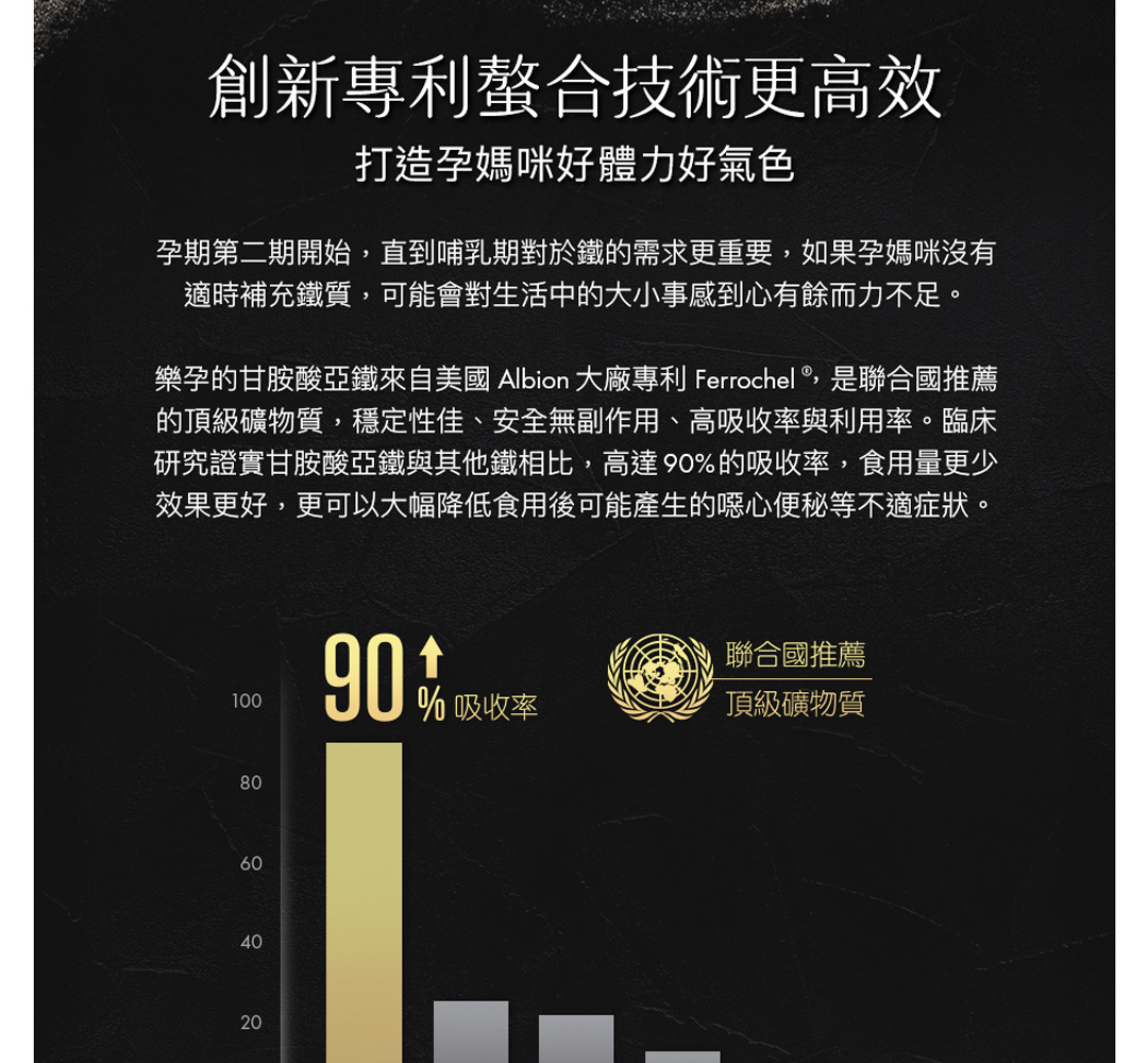 • 精選美國專利 FerroChel® 甘胺酸亞鐵,高達 9 成吸收率,不便祕
