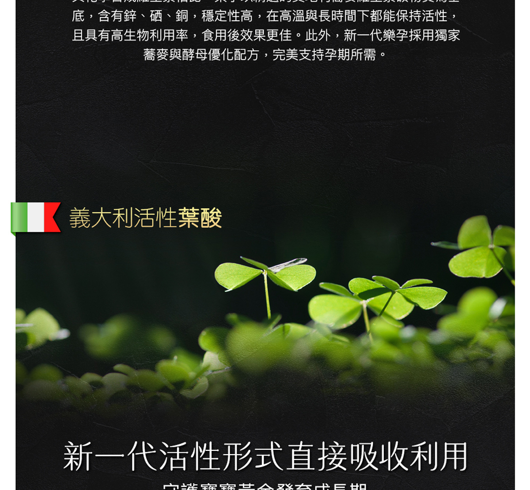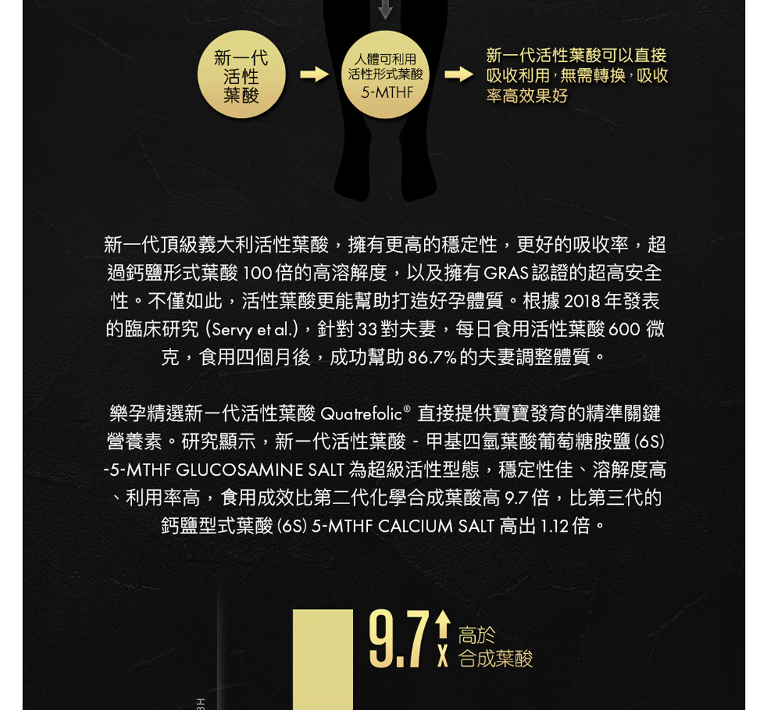 • 添加義大利專利 Quatrefoilic® 活性葉酸,是一般合成葉酸 9.7 倍成效