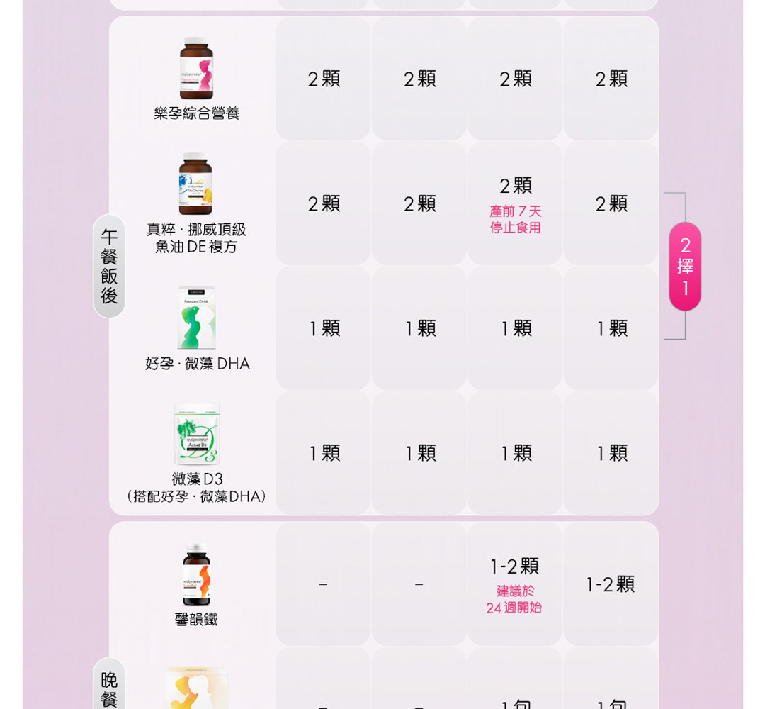 午餐飯後:樂孕綜合營養膠囊 + 好孕 DHA 藻油
