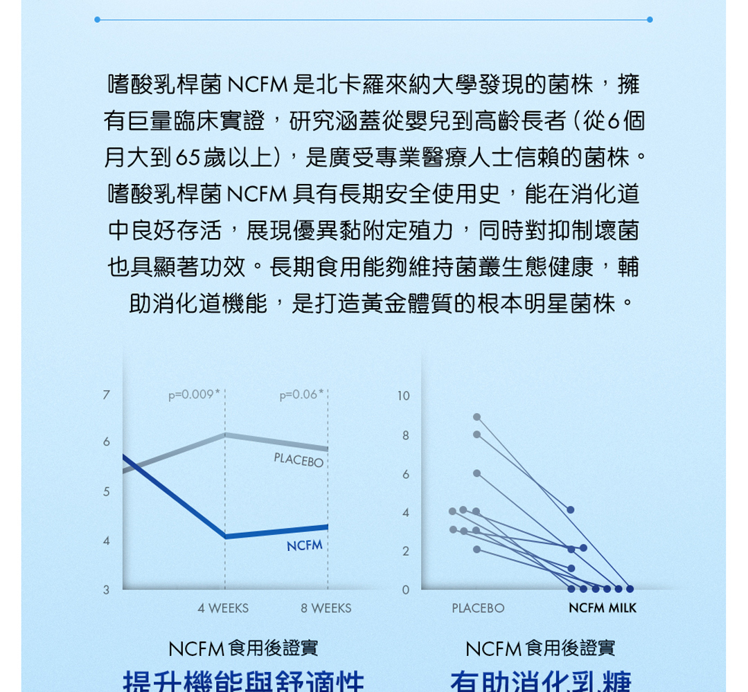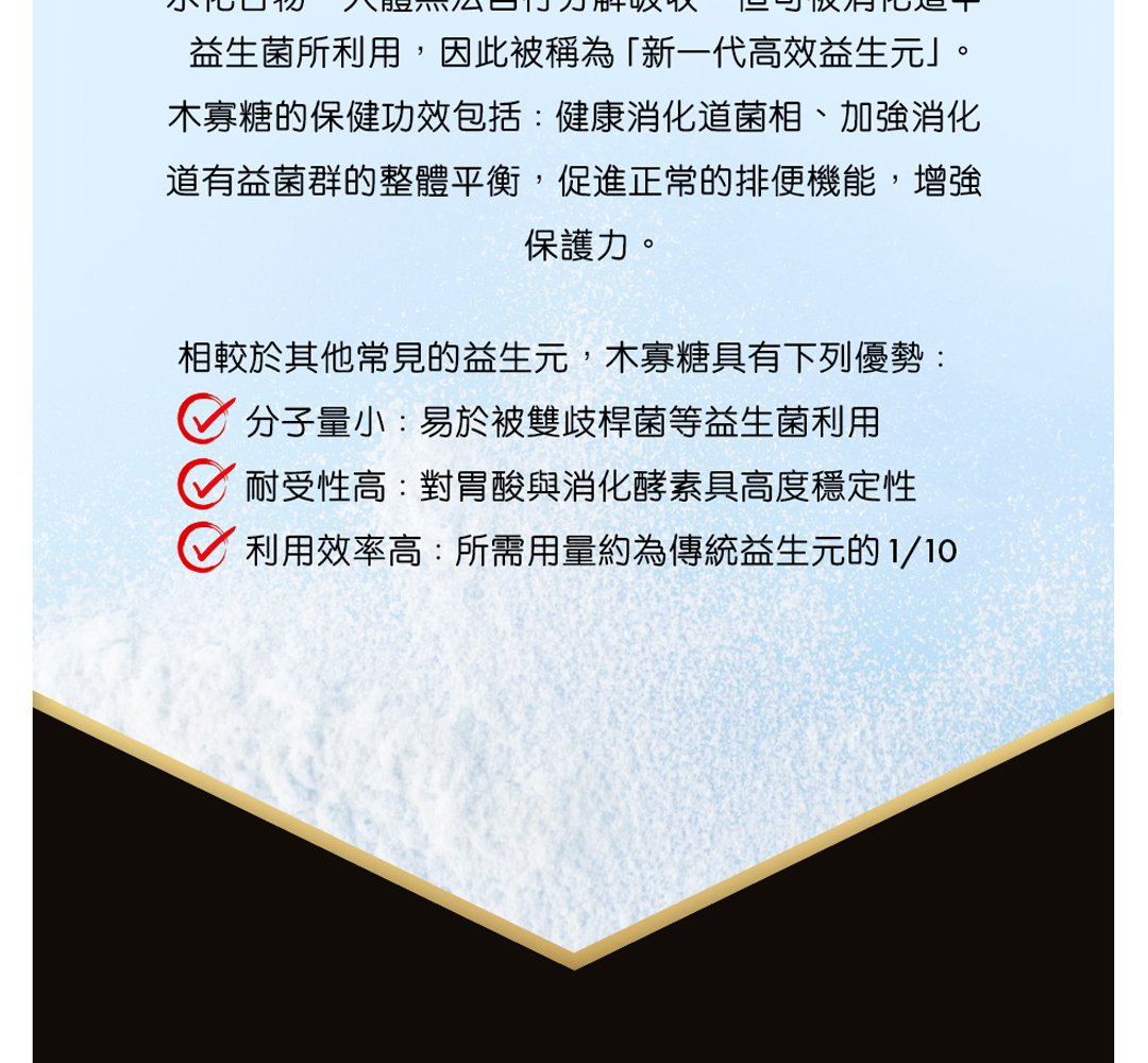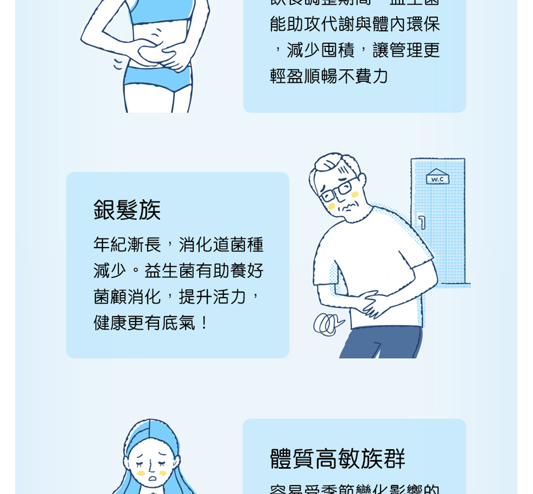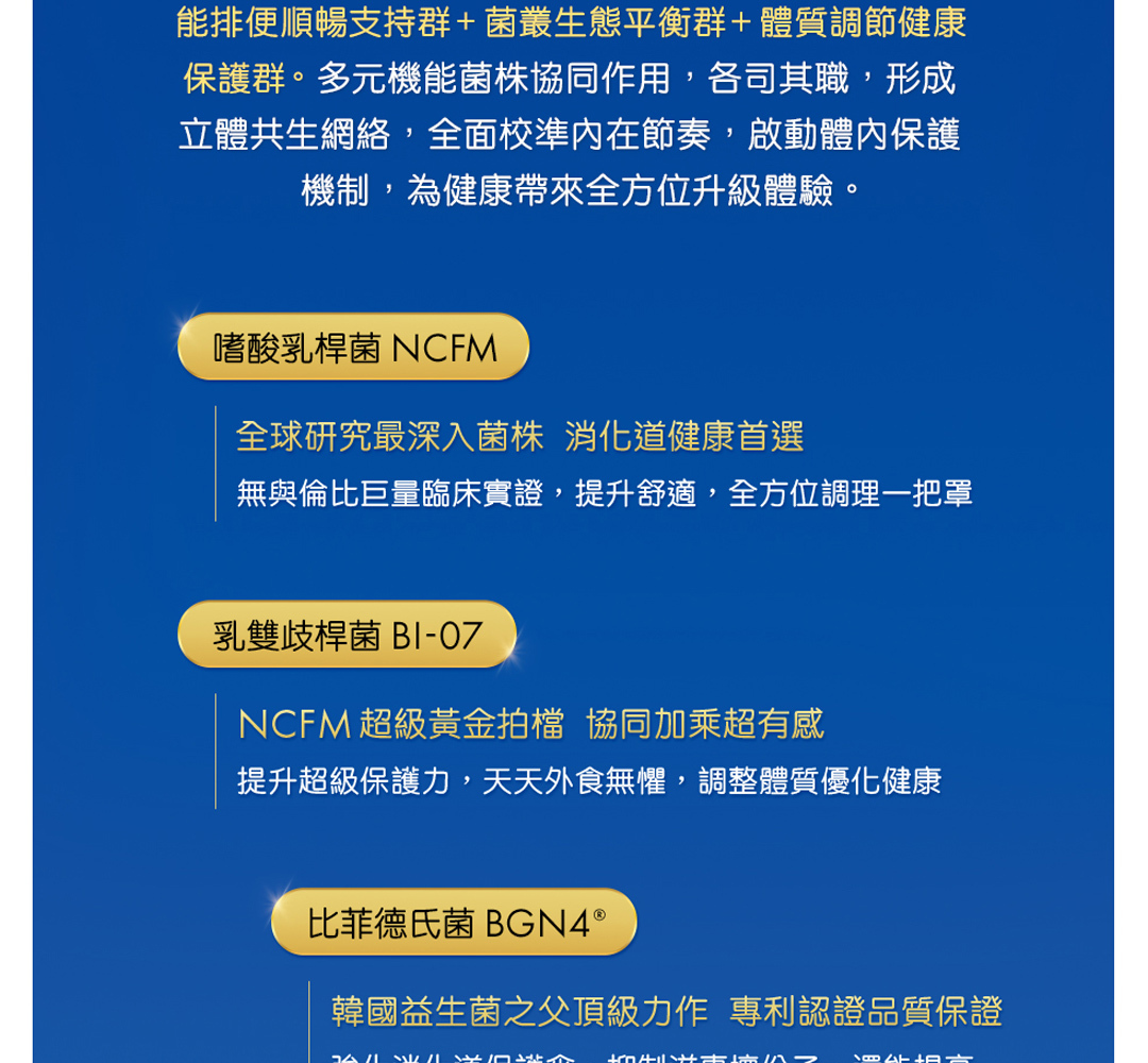 這些菌株搭配益生元木寡糖,能提供全方位的健康照護,完整提升消化道機能與健康。而這些菌株也適合各年齡層補充。