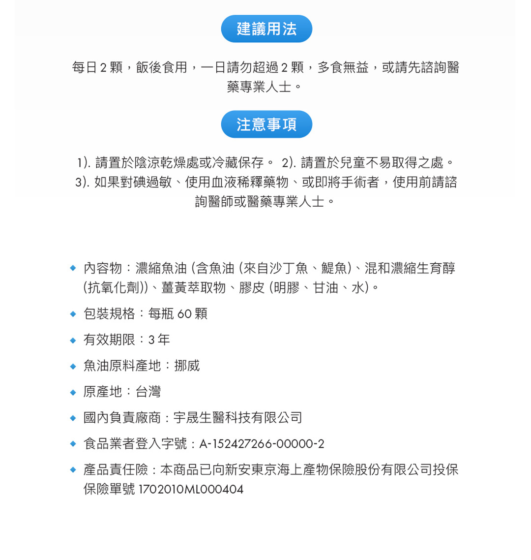 假如您正服用血液稀釋藥物、高血壓藥物、阿斯匹靈,或其他藥物,我們建議您先與醫師或醫療專業人士諮詢過後再食用薑黃與魚油。