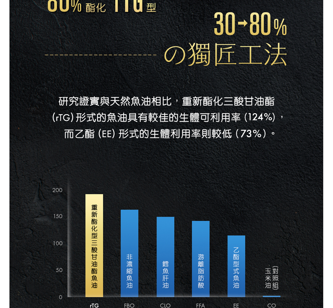 • rTG 型 (重新酯化三酸甘油酯型) :濃縮後再轉換回接近天然的 TG 型結構,兼具高濃度與高吸收率,是目前吸收效率最佳的形式。