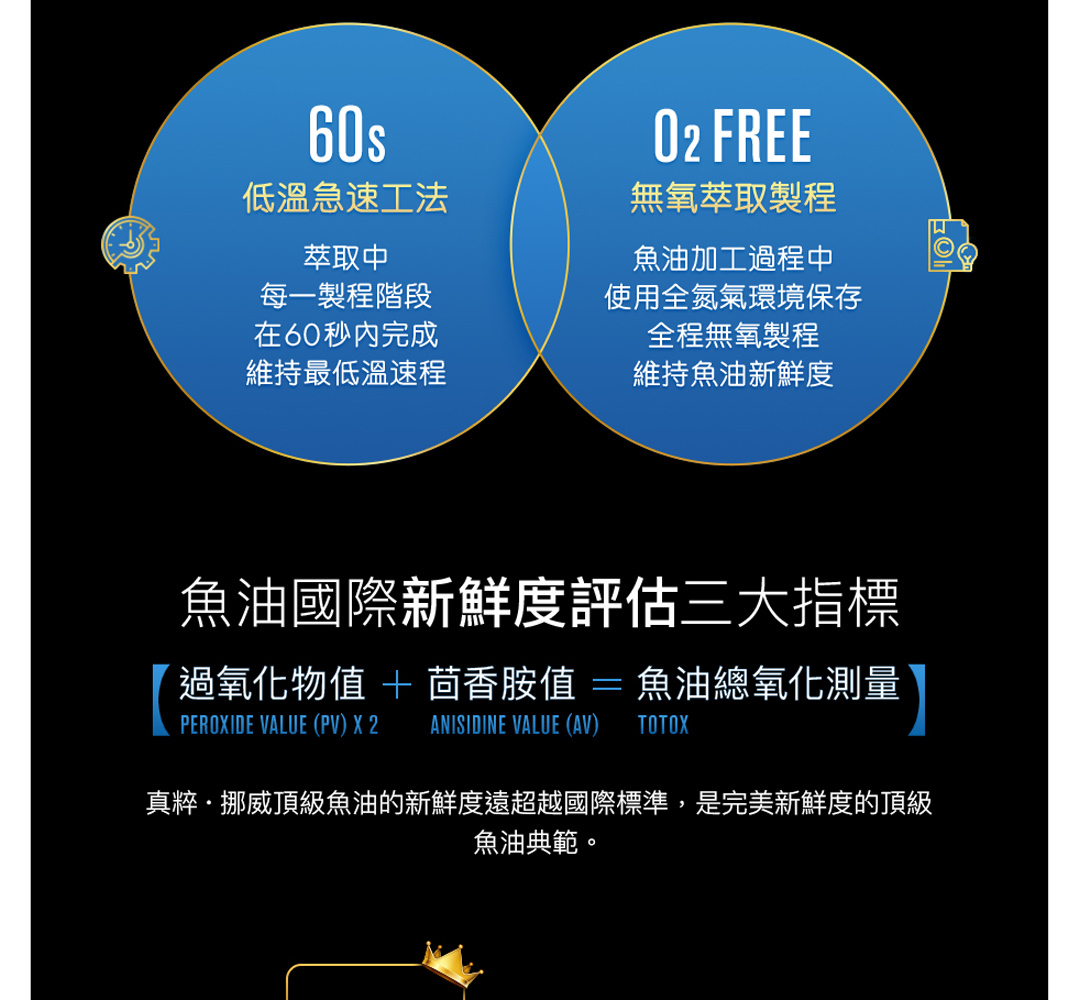 魚油在加工過程中易因高溫、長時間、氧氣而導致氧化,氧化後的魚油具有濃厚的臭腥味,食用後不僅無法帶來健康效益,更因含氧化物而可能造成食用後的負面風險。魚油製造選擇全程無氧環境,無接觸氧氣,大幅降低氧化的機會。此外,選擇低溫急速工法,讓魚油在每一步驟都能快速加工萃取完成,避免高溫與長時間可能導致的氧化反應,也是維持高品質魚油必備製程。而經過無氧、低溫、急速製程的魚油,能維持最佳的新鮮度並帶來食用後的良好功效。