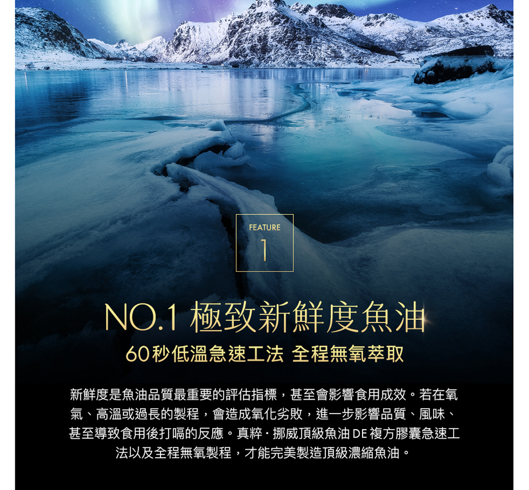 真粹·挪威頂級魚油 DE 複方膠囊精選挪威 VIVOMEGA® 頂級魚油,獨家 VIVOTECH™ 製程與 VIVOSURE™工法打造極致品質的 rTG 形式魚油,並添加高純度維生素 D3 及維生素 E,同時滿足身體三大關鍵營養素需求。真粹 · 挪威頂級魚油 DE 複方膠囊榮獲國際六項大獎與認證,高純度、極致濃度、絕佳新鮮度與風味,獲得國際評審的肯定,更值得您的信賴。
