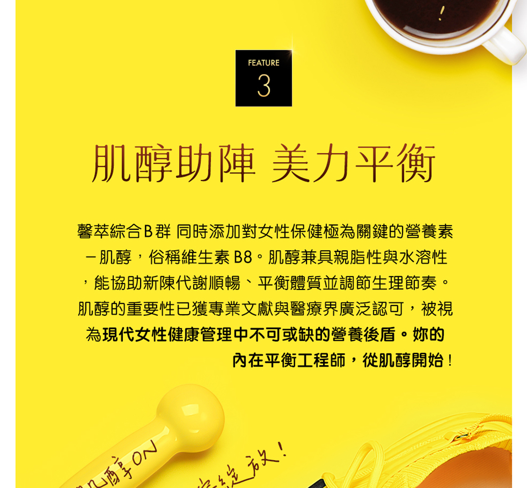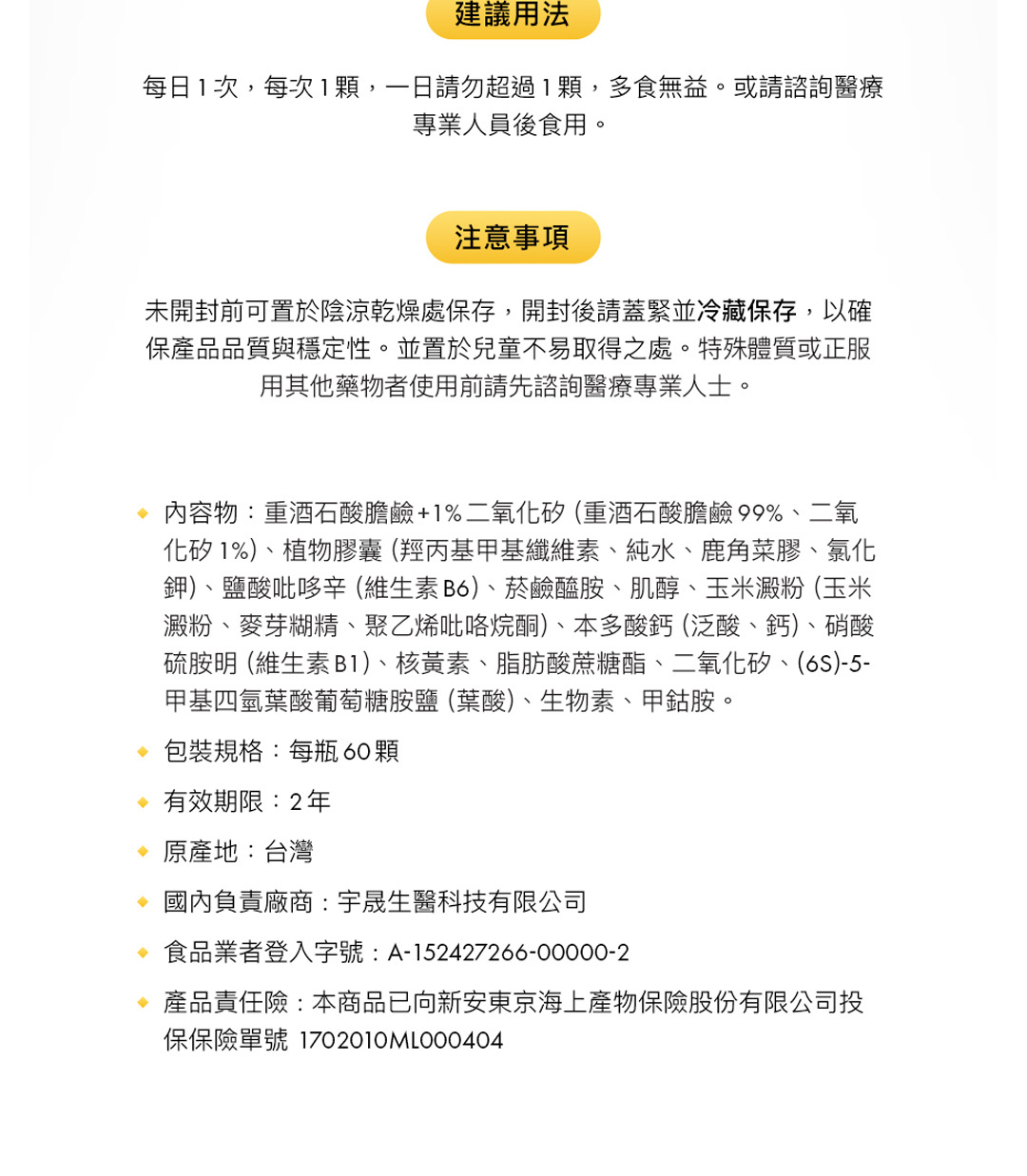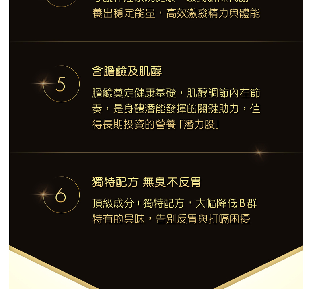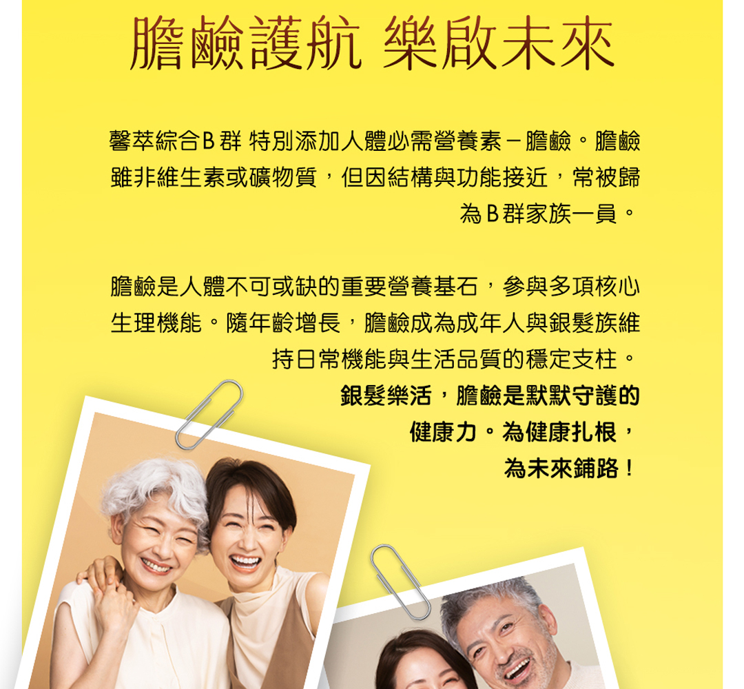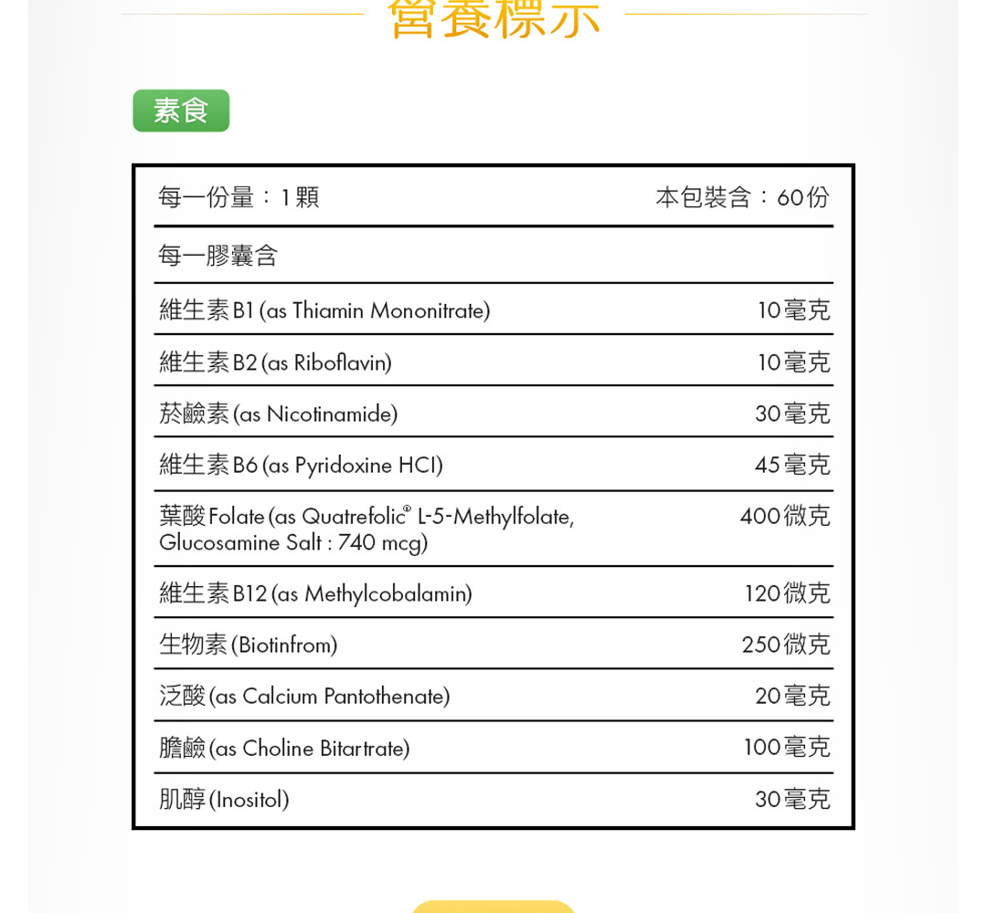 • 市售少見完整十大類 B 群成分,含有肌醇與膽鹼