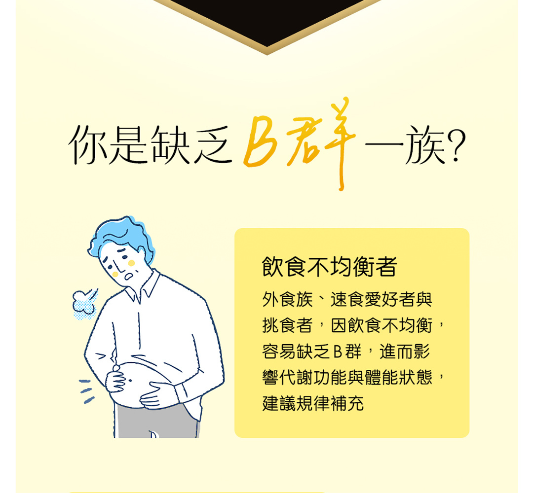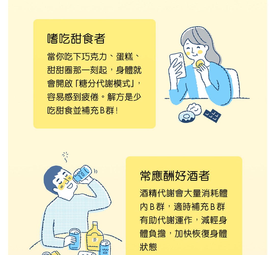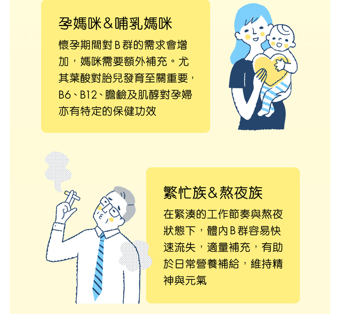 | 緊張壓力大、工作忙碌者 | 長期處於緊張、過度勞累會加速 B 群消耗,B 群有助增強體力,提振精神 |