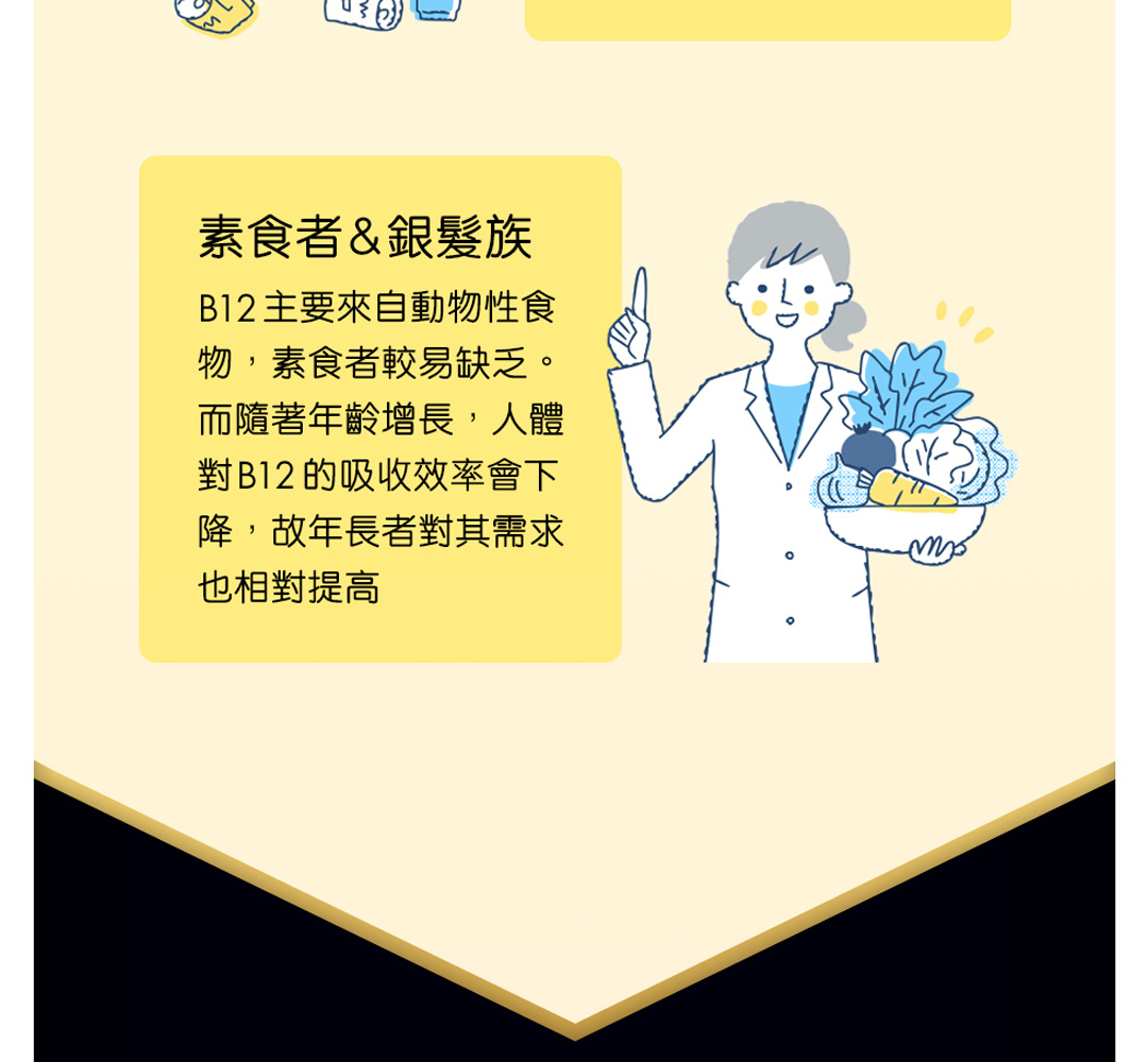 | 年長者 | 營養素吸收能力可能影響;特別需要留意維生素 B12 是否足夠,以確保支持神經系統健康 |