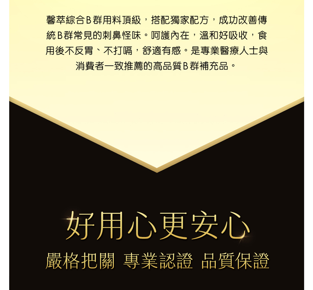 馨萃綜合 B 群是針對現代忙碌緊湊工作、飲食不均衡的生活型態所研發的配方。舉例來說,高量維生素 B6 適合生活步調緊湊的繁忙工作族,有助於舒緩放鬆;高量維生素 B12,是依據科學文獻與美國國衛院的建議下,考量人體吸收率而調整的比例。