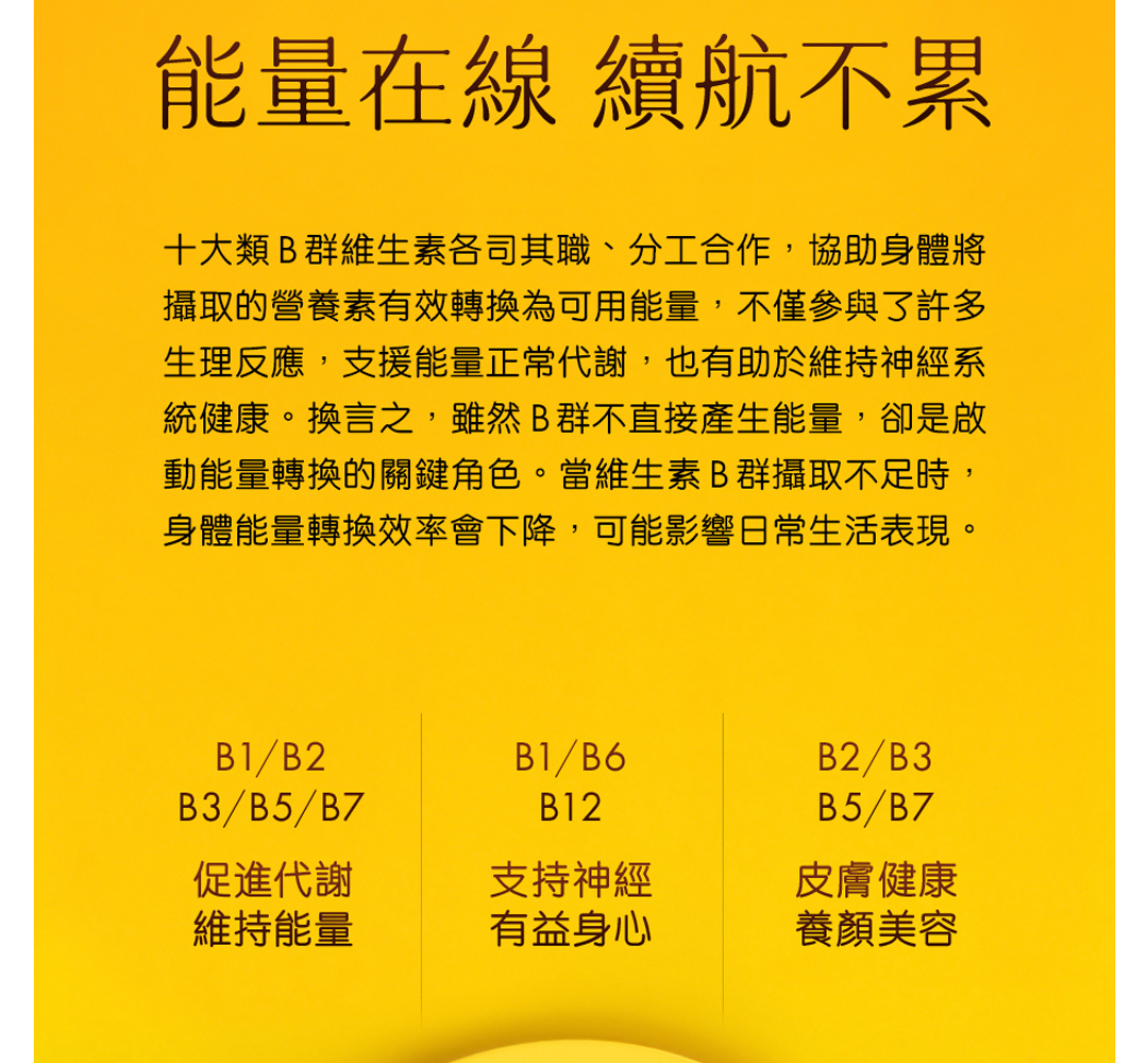 除此之外,水溶性的特性讓 B 群無法在體內儲存,每天都會消耗流失。忙碌壓力、熬夜、飲酒、甜食、咖啡因攝取等都會加速 B 群消耗。現代人飲食多為精緻加工食品,蔬果類攝取減少,容易缺乏天然 B 群來源,所以規律補充更佳。