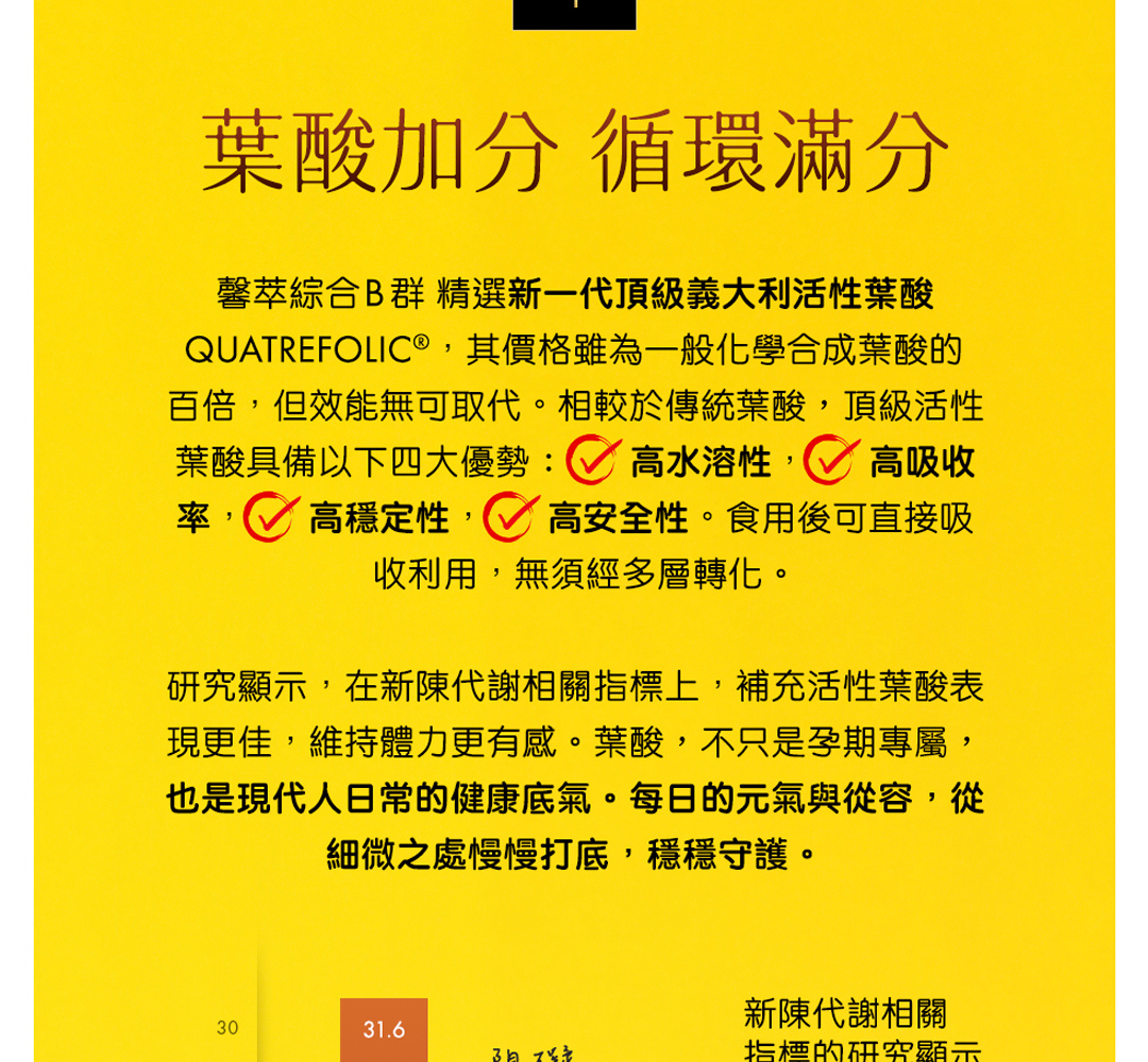 馨萃綜合 B 群選用義大利 Quatrefolic® 活性葉酸,經臨床驗證,成效是合成形式 9.7 倍,並且在歐美有 10 項科學臨床實證。「活性葉酸」及「活性 B12 (甲鈷胺)」與天然食物中形式相同,也是人體內的主要形式,具有最佳的吸收利用率。