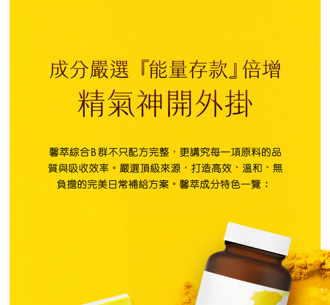馨萃綜合 B 群是針對現代高張忙碌世代所研發的活性 B 群配方,嚴選 10 大類完整成分,有助維持能量代謝、提升精神與專注力、情緒穩定。每日一顆,快速補足關鍵元氣營養,讓你從早到晚維持好精神。無人工色素、無防腐劑,純淨配方更安心。