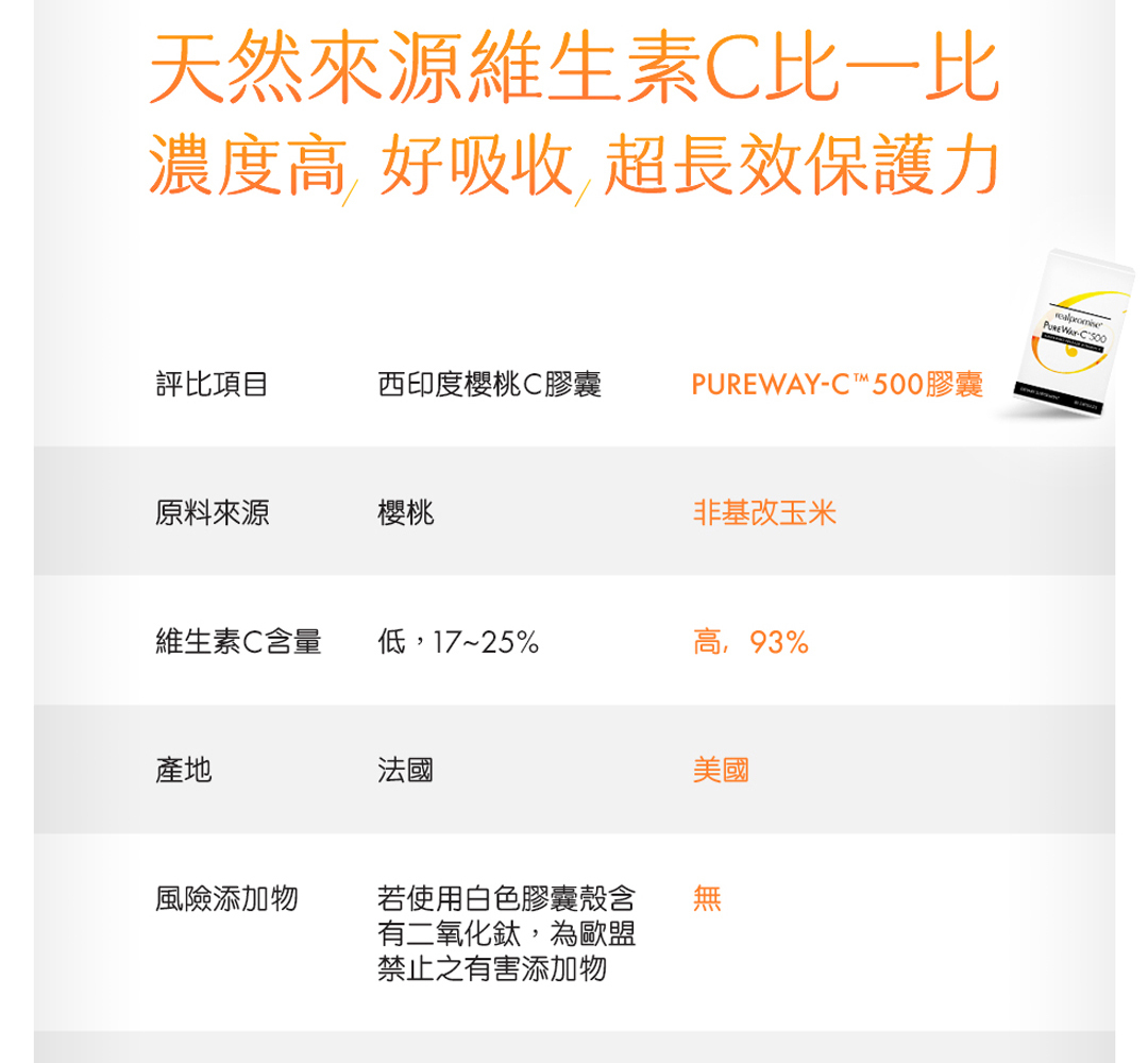 西印度櫻桃萃取維生素 C 的另一個缺點是濃度低,所以一顆膠囊中所含的維生素 C 含量通常不高。但在 PureWay-C® 中所含的天然維生素 C 高達 93%,因此具有更高的含量與成效。