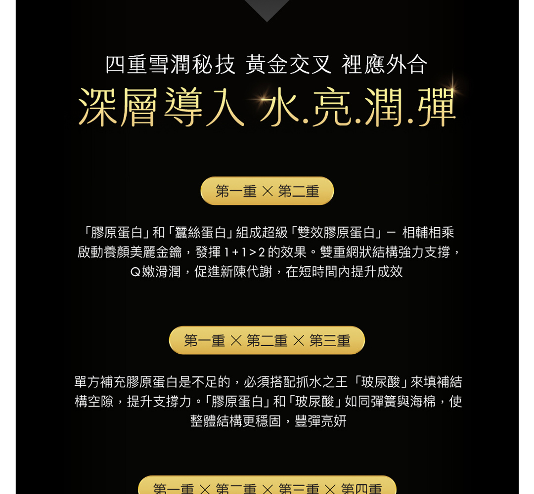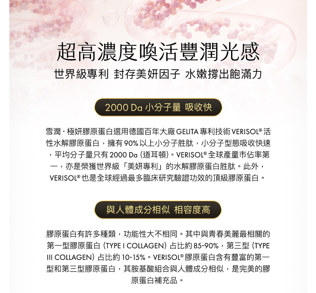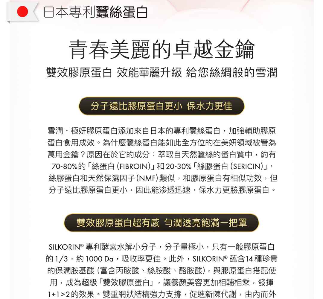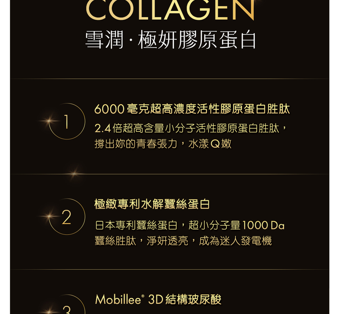 雪潤·極妍膠原蛋白精選四大頂級美顏成分,包含平均分子量 2000 道爾頓的超濃小分子活性膠原胜肽、3D 水網複合型玻尿酸、Oricera 玄米萃取物 (含 10% 神經醯胺/賽洛美)、 以及 1000 道爾頓超小分子蠶絲蛋白胜肽。四大美顏成分,完美超足量,給予愛美女性強力奧援,幫助維持青春美麗、養顏美容。