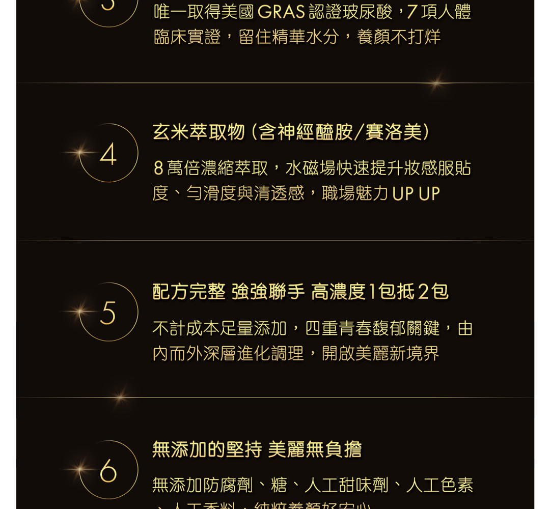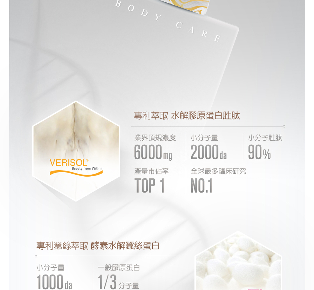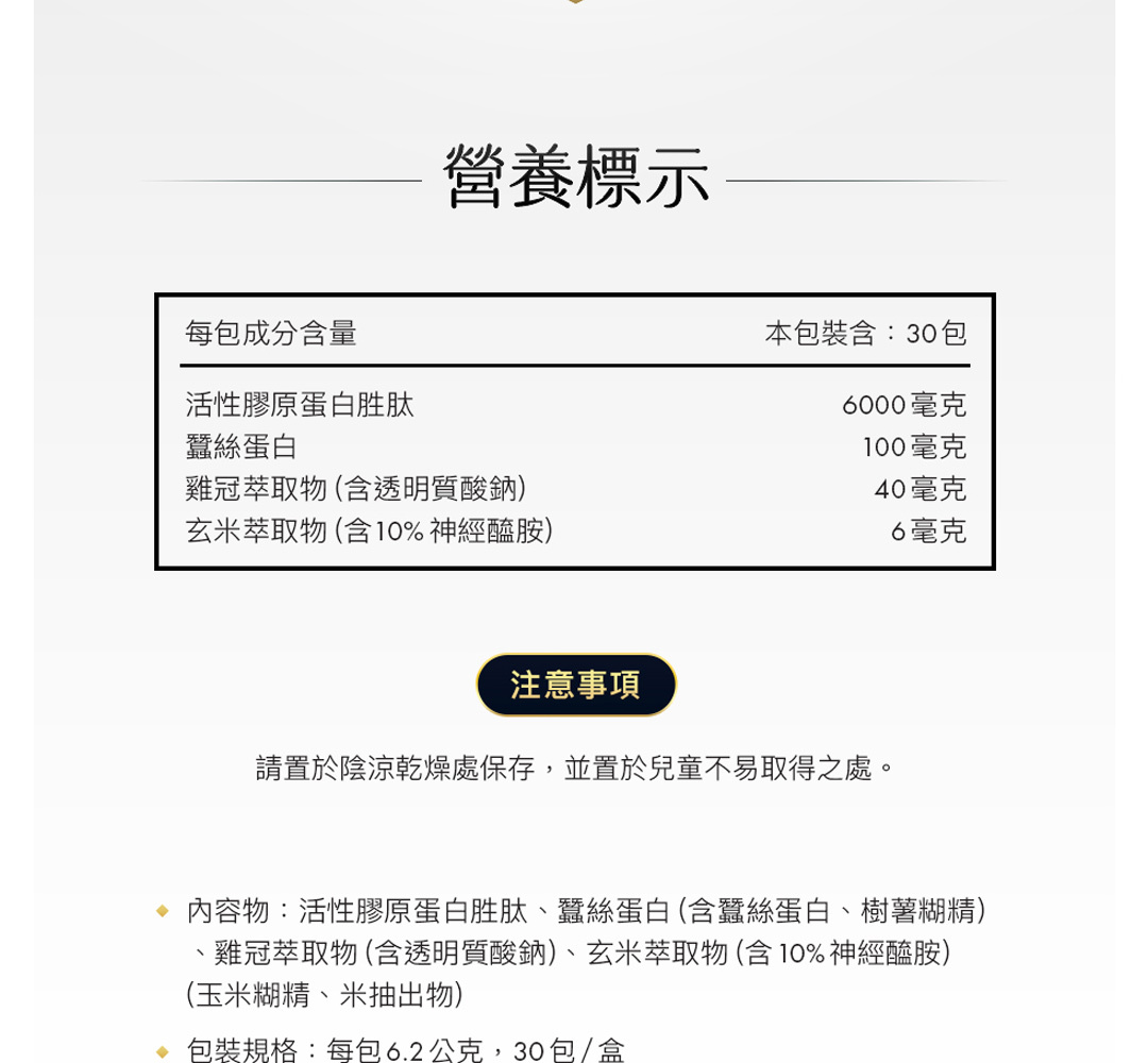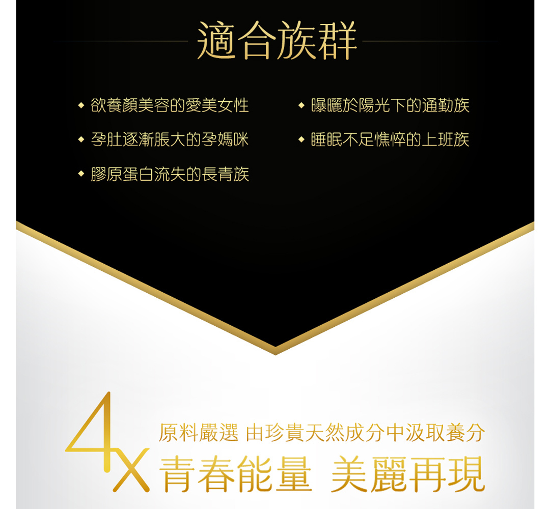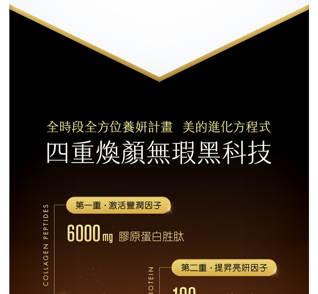 雪潤·極妍膠原蛋白精選四大頂級美顏成分,包含平均分子量 2000 道爾頓的超濃小分子活性膠原胜肽、3D 水網複合型玻尿酸、Oricera 玄米萃取物 (含 10% 神經醯胺/賽洛美)、 以及 1000 道爾頓超小分子蠶絲蛋白胜肽。四大美顏成分,完美超足量,給予愛美女性強力奧援,幫助維持青春美麗、養顏美容。