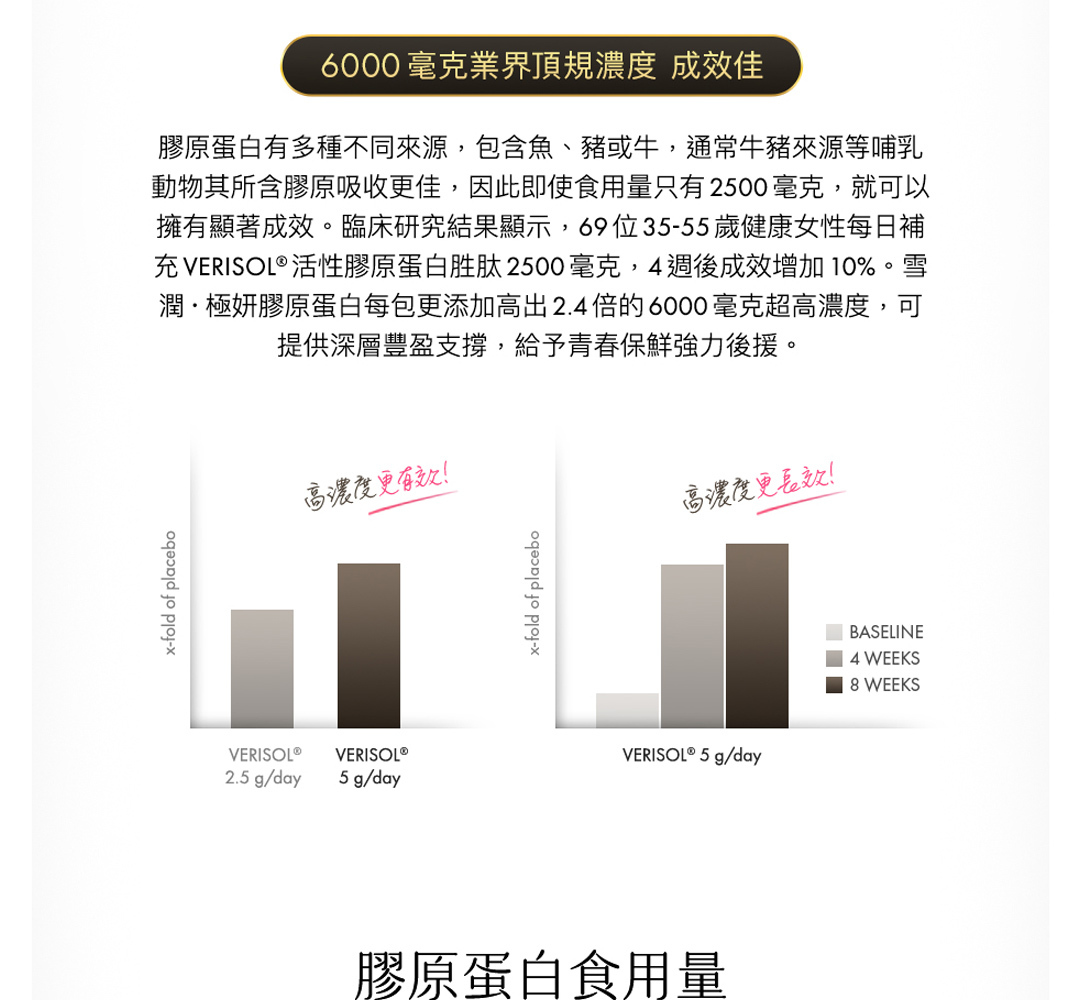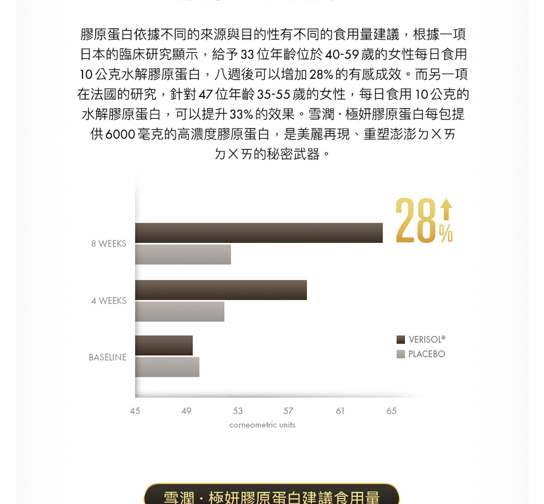 膠原蛋白食用成效跟膠原蛋白的選擇與食用量有關。雪潤極妍膠原蛋白所選用的是具有科學根據、經過大量臨床驗證的頂級水解膠原蛋白胜肽,而在歐美的科學臨床研究上,食用 4~8 週就可以帶來明顯的感受性。不過由於成年人自身的膠原蛋白會隨著年齡增加逐漸加速流失,因此建議長期每天規律補充,更能維持良好的成效。