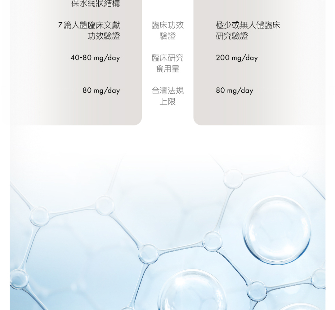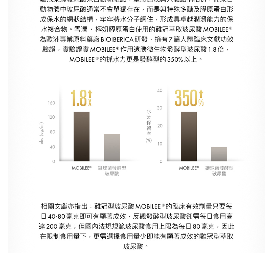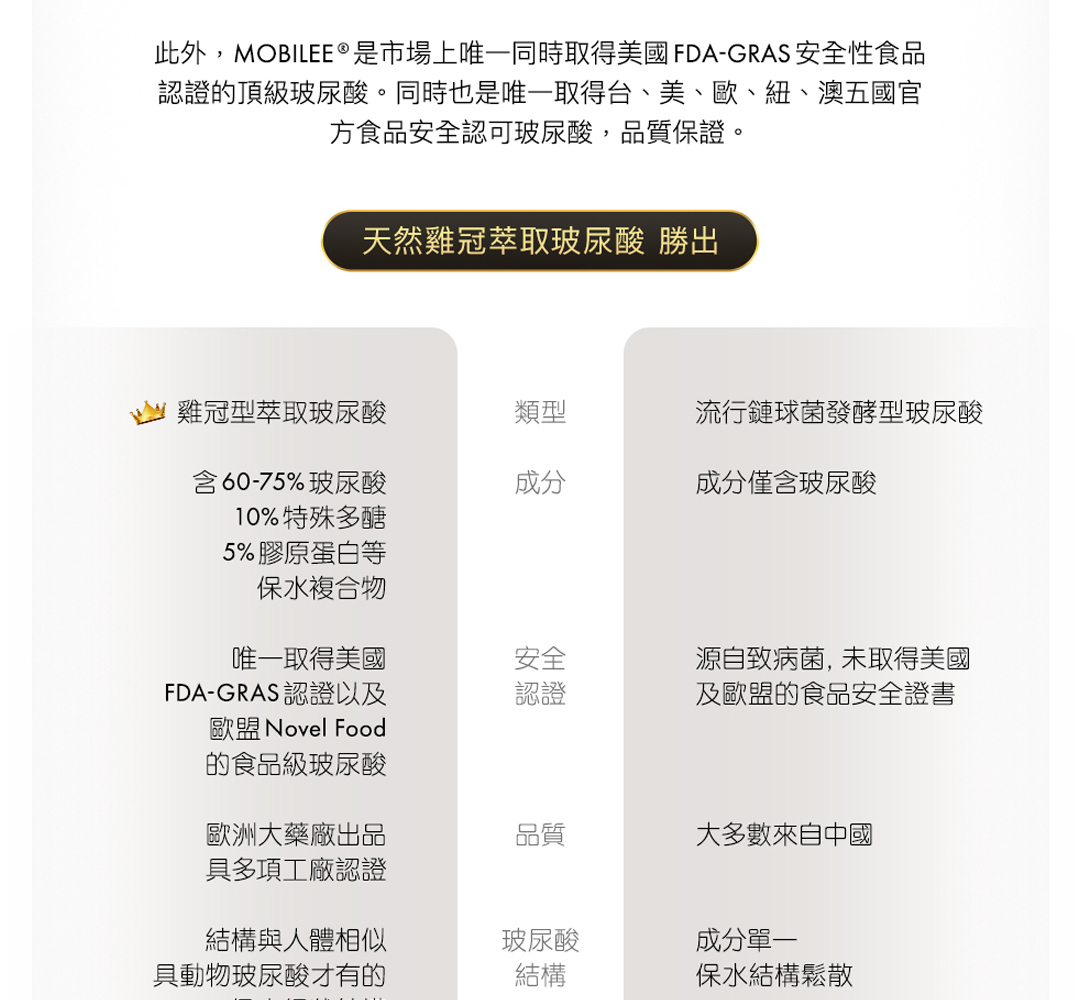 一般玻尿酸常見微生物發酵製成,成分單一,雖然濃度高,但並非最有效。而雞冠萃取的複合型玻尿酸,內含玻尿酸 (60~75%) + 黏多醣體 (5~15%) + 雞冠膠原 (5~20%) 形成 3D 保水網三維矩陣結構,保水力優於單一玻尿酸。研究指出,發酵型玻尿酸每日所需攝取量需 200 毫克,而 Mobilee® 每日卻僅需 80 毫克。