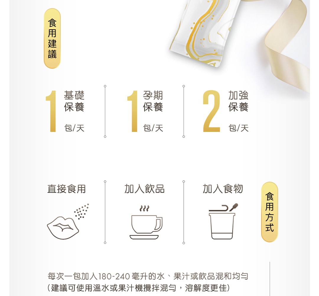雪潤膠原本身已經是高含量配方,每天 1~2 包即可,並不需要多吃。膠原蛋白在研究上不同的食用量可以提供不同的目的性與幫助。對於女性維持青春美麗,雪潤膠原每日保養 1 天 1 包即可。如果想要加強型的成效,例如對於膠原需求較高的女性、剛打完醫美療程、或孕期期間,都可以 1 天 2 包,分次食用,可以帶來高含量,非常滿意的效果。