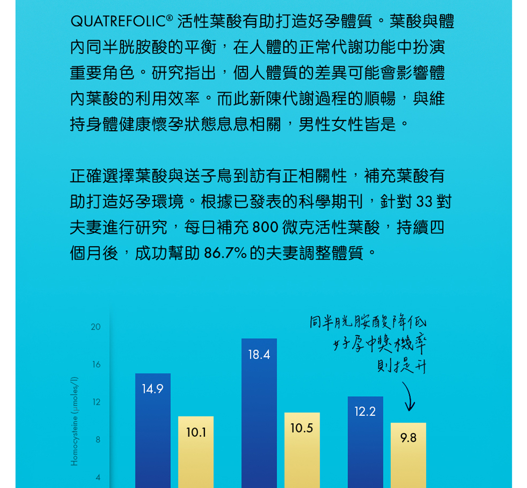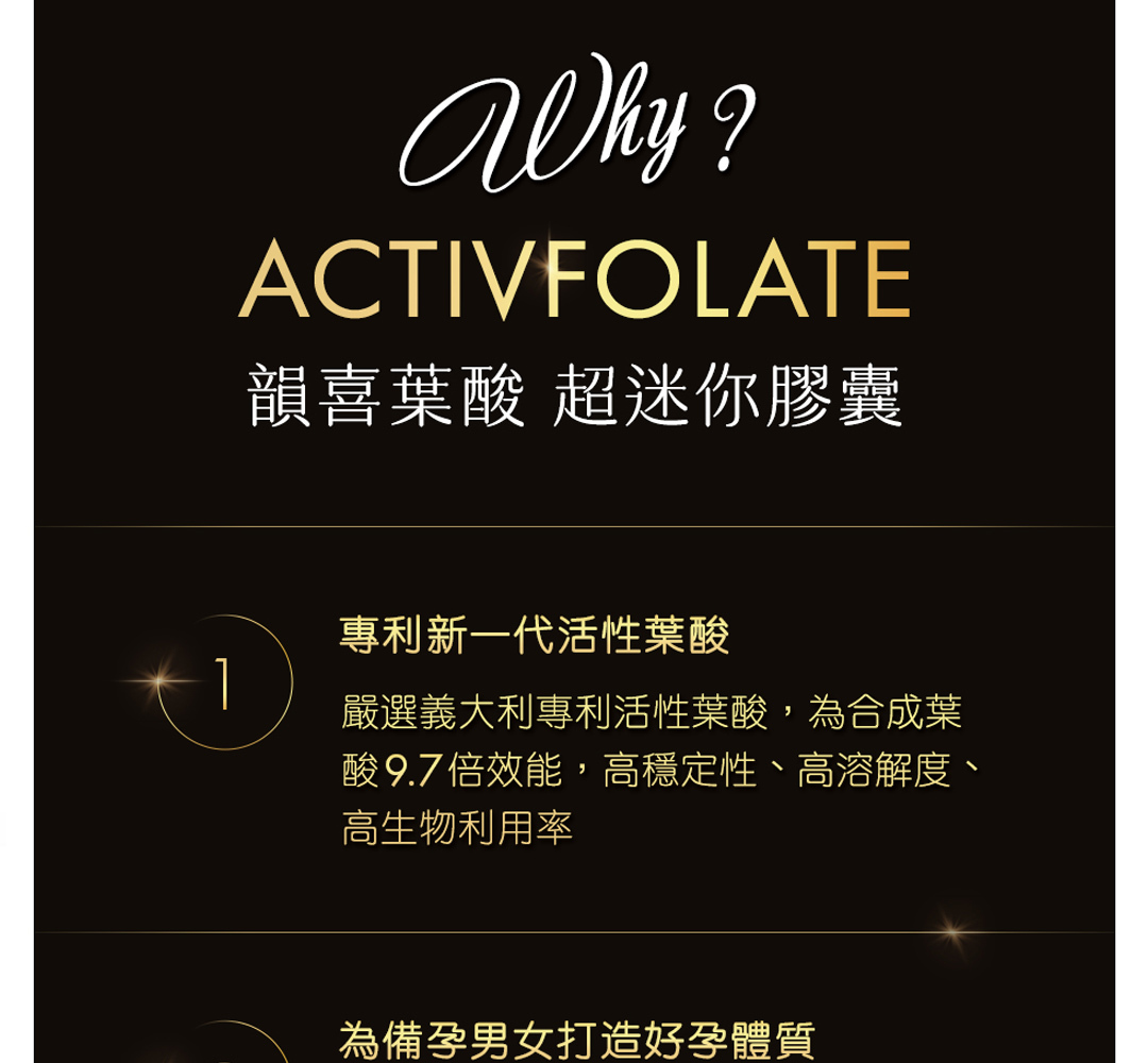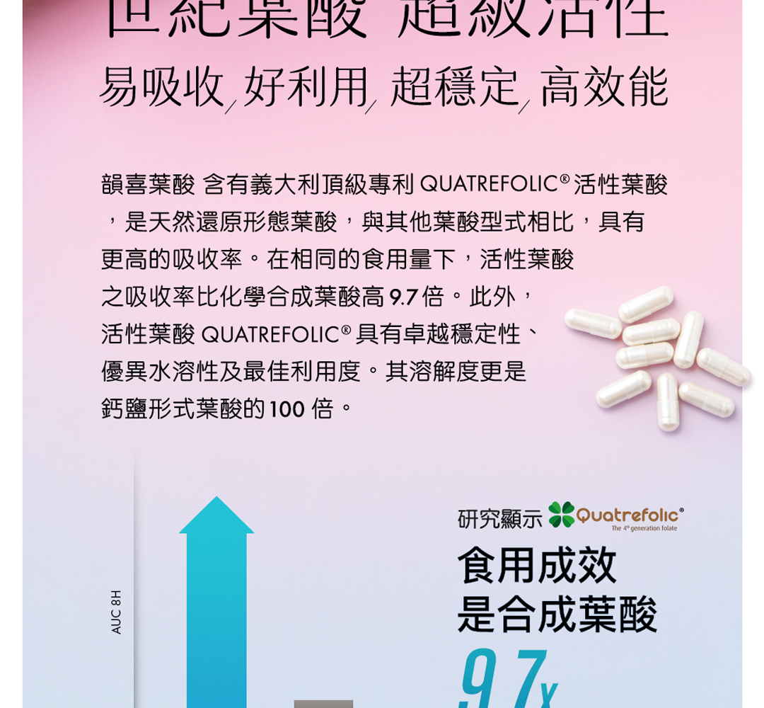 韻喜葉酸精選義大利第四代 Quatrefolic® 活性葉酸,是化學合成葉酸 9.7 倍成效。 Quatrefolic® 活性葉酸經歐美多項科學期刊發表研究,目前已有 10 篇以上人體臨床實證功效。尤其對於備孕期夫妻,經男女性雙方同時補充後,臨床實證可提升 86.7% 好孕氣,是兼顧備孕期與全孕期最佳首選葉酸。