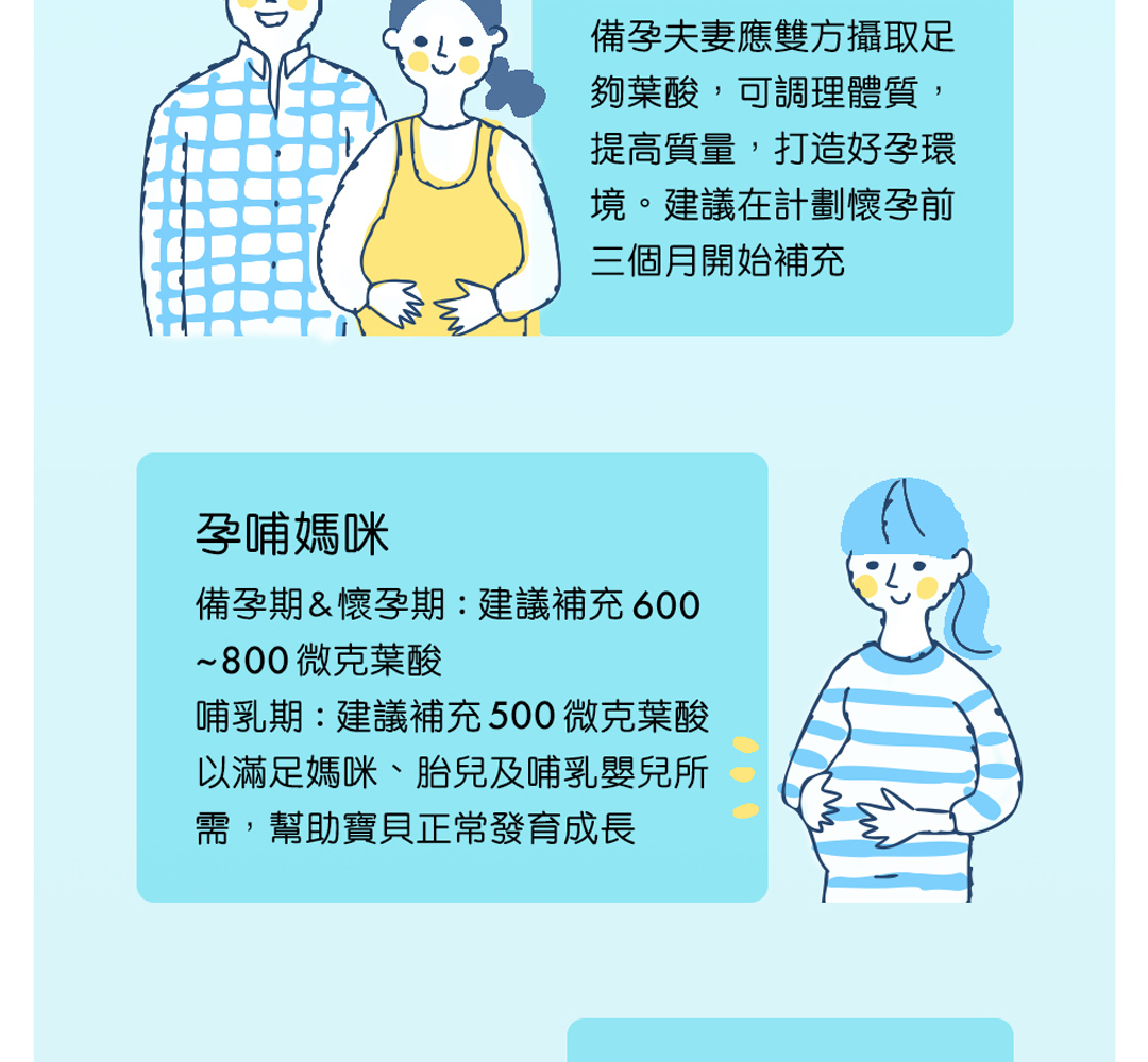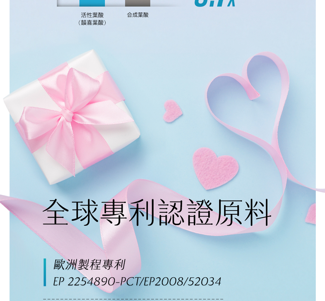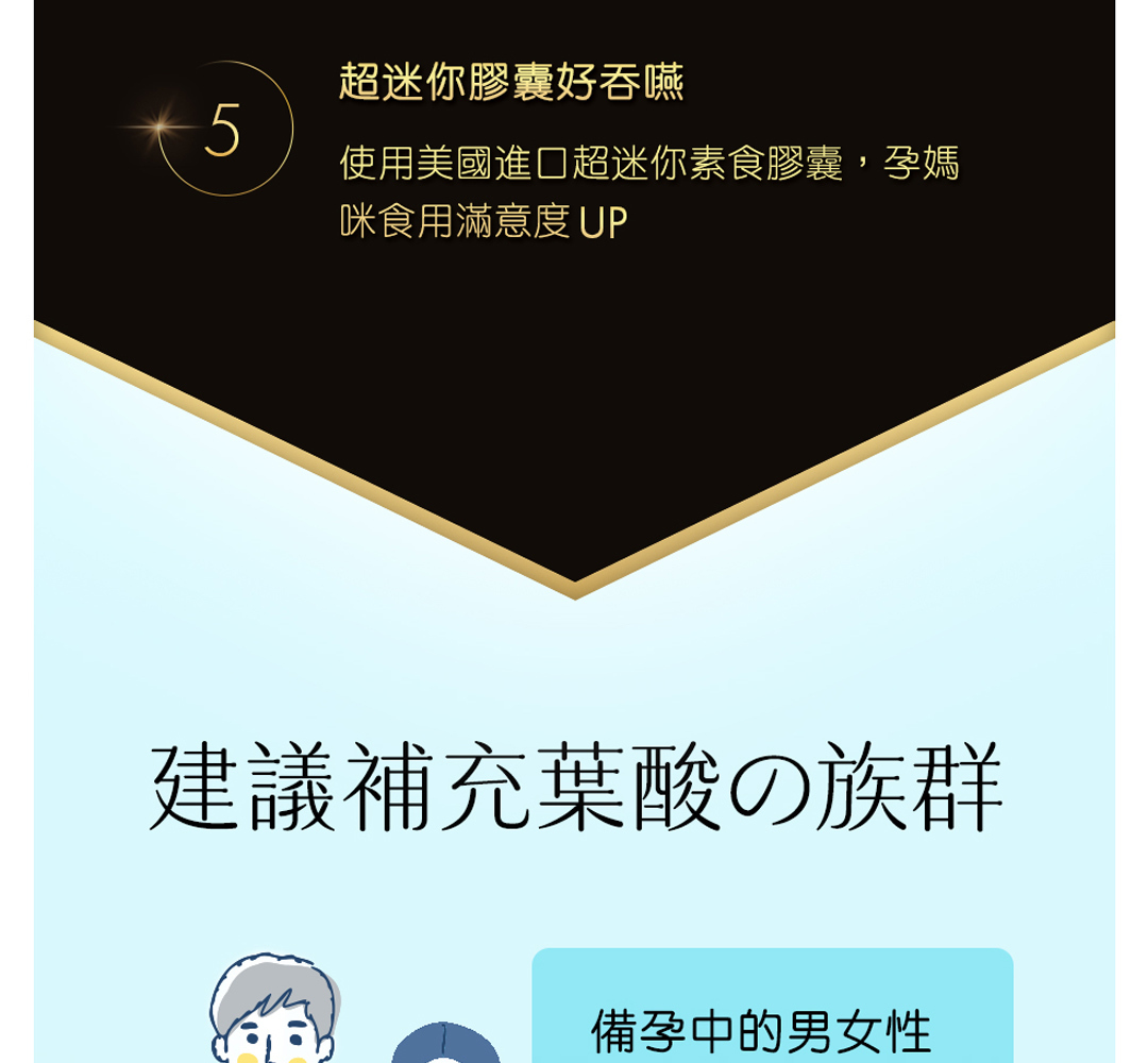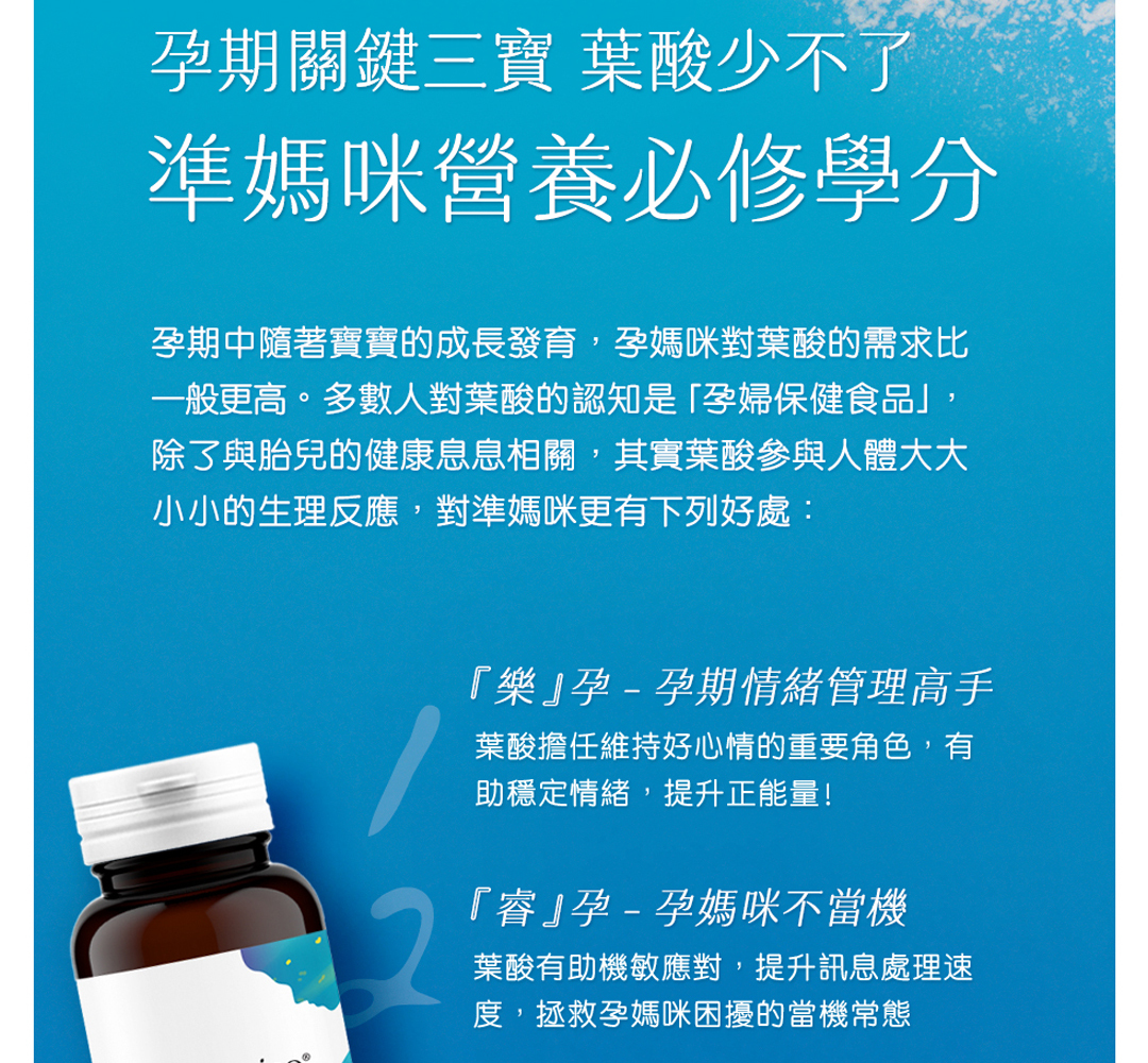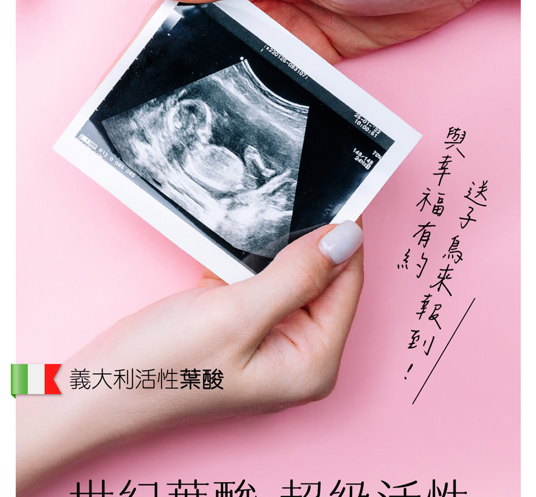 • 懷孕初期是快速發育的關鍵時期,建議持續補充葉酸至全孕期,尤其選擇活性型葉酸 (5-MTHF) 更能確保吸收