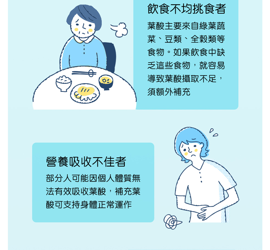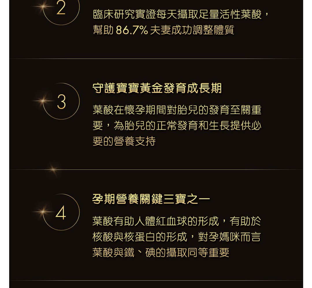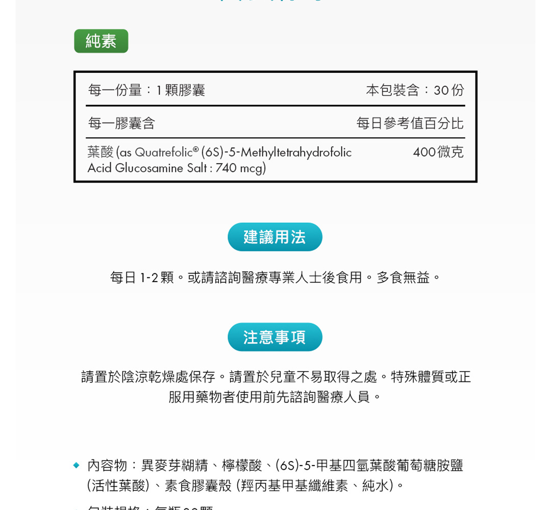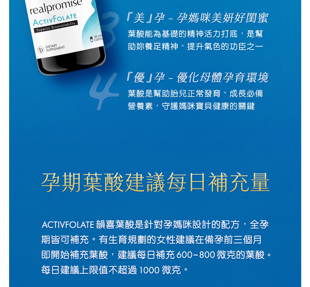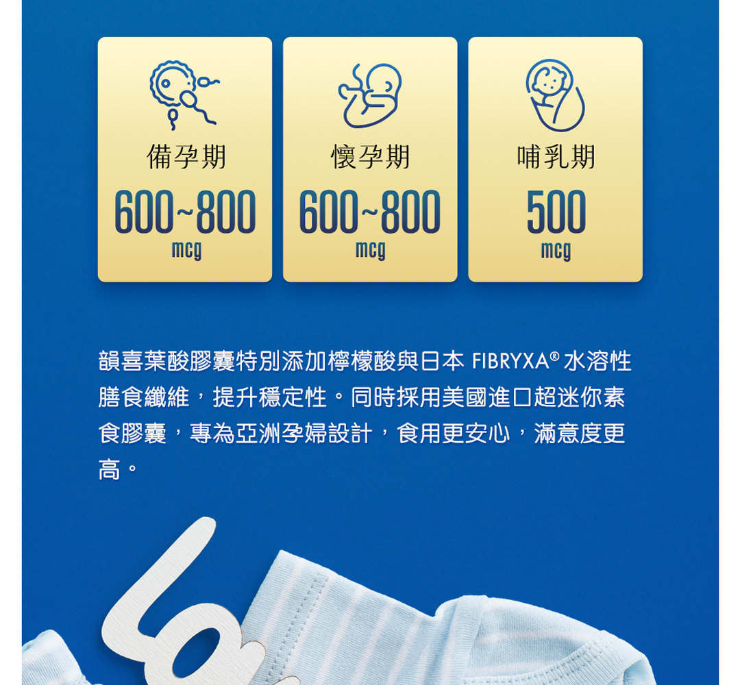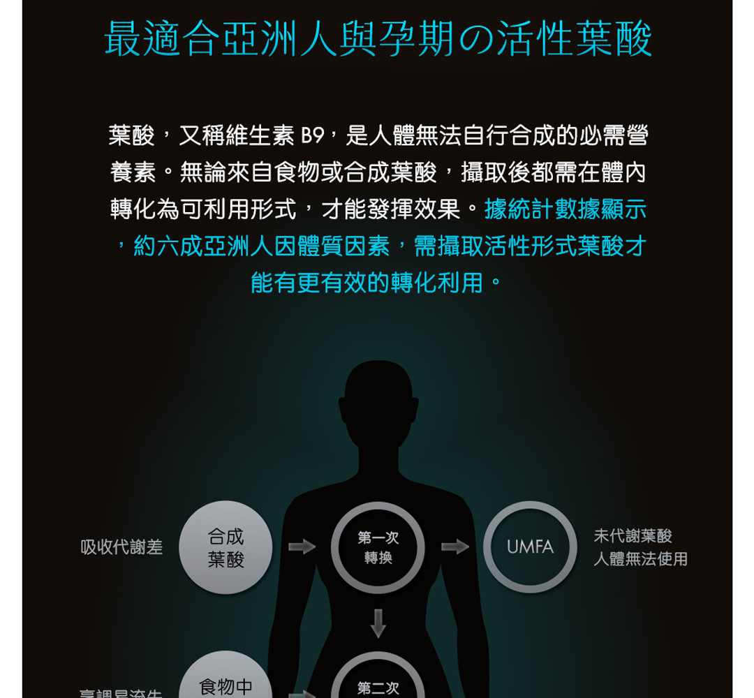 • 懷孕初期是快速發育的關鍵時期,建議持續補充葉酸至全孕期,尤其選擇活性型葉酸 (5-MTHF) 更能確保吸收