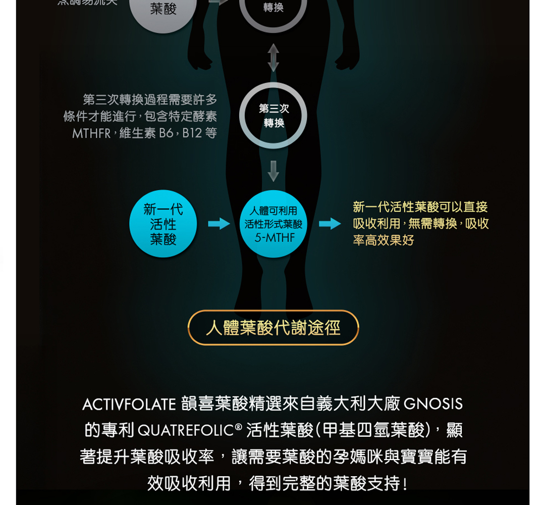 一般市售營養補充品的葉酸 (Folic Acid) 幾乎皆為化學合成葉酸,但由於部分亞洲人基因多型性影響的關係,約有六成的人可能無法有效吸收利用,食用後也可能因為無法代謝而累積體內產生潛在性副作用。韻喜葉酸選用最新第四代義大利 Quatrefolic® 活性葉酸,與天然食物中和人體中形式相同,食用後可以直接利用,避免受到基因多型性影響。第四代活性葉酸的台灣法定名稱為「(6S)-5-甲基四氫葉酸葡萄糖胺鹽」,仔細參考您食用的保健品包裝成分標示,即可確認是否為活性葉酸。