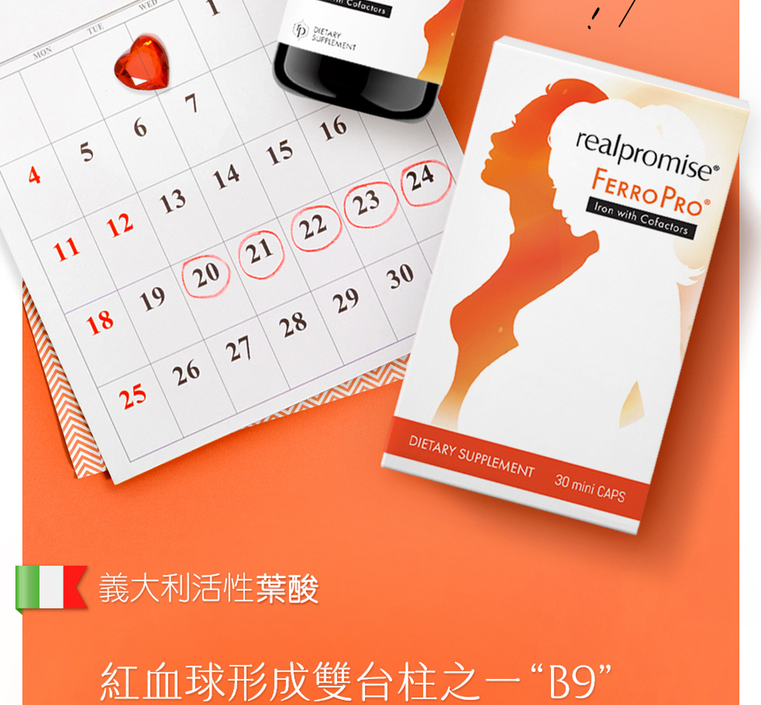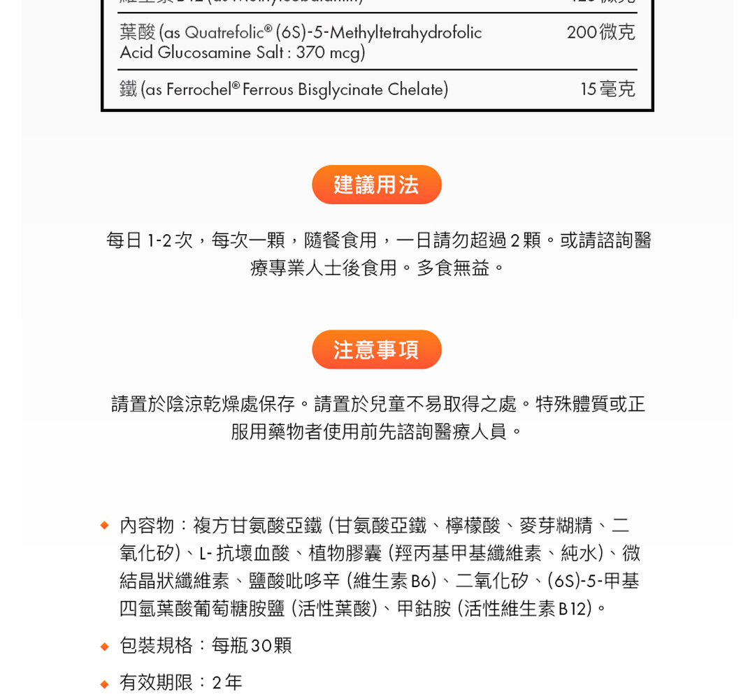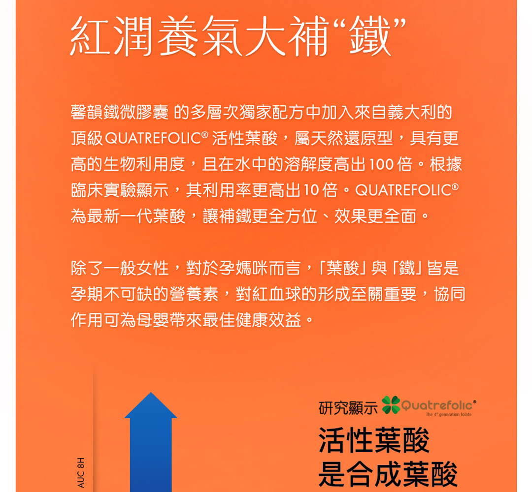 ▫ 葉酸:精選義大利臨床實證 Quatrefolic® 活性葉酸,有助於紅血球的形成